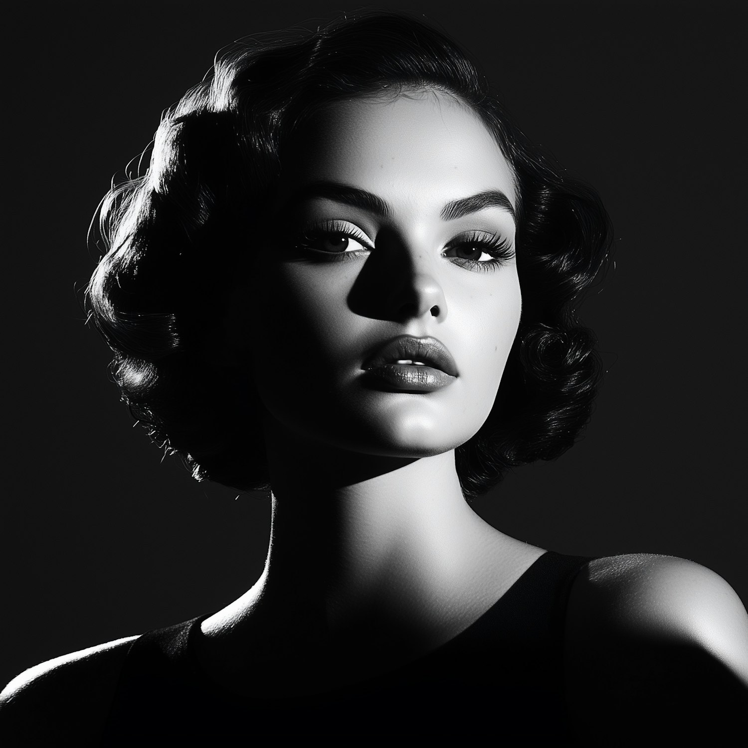 Elegant black-and-white portrait of a woman with vintage curls, bold makeup, and dramatic lighting for a timeless, classic look.