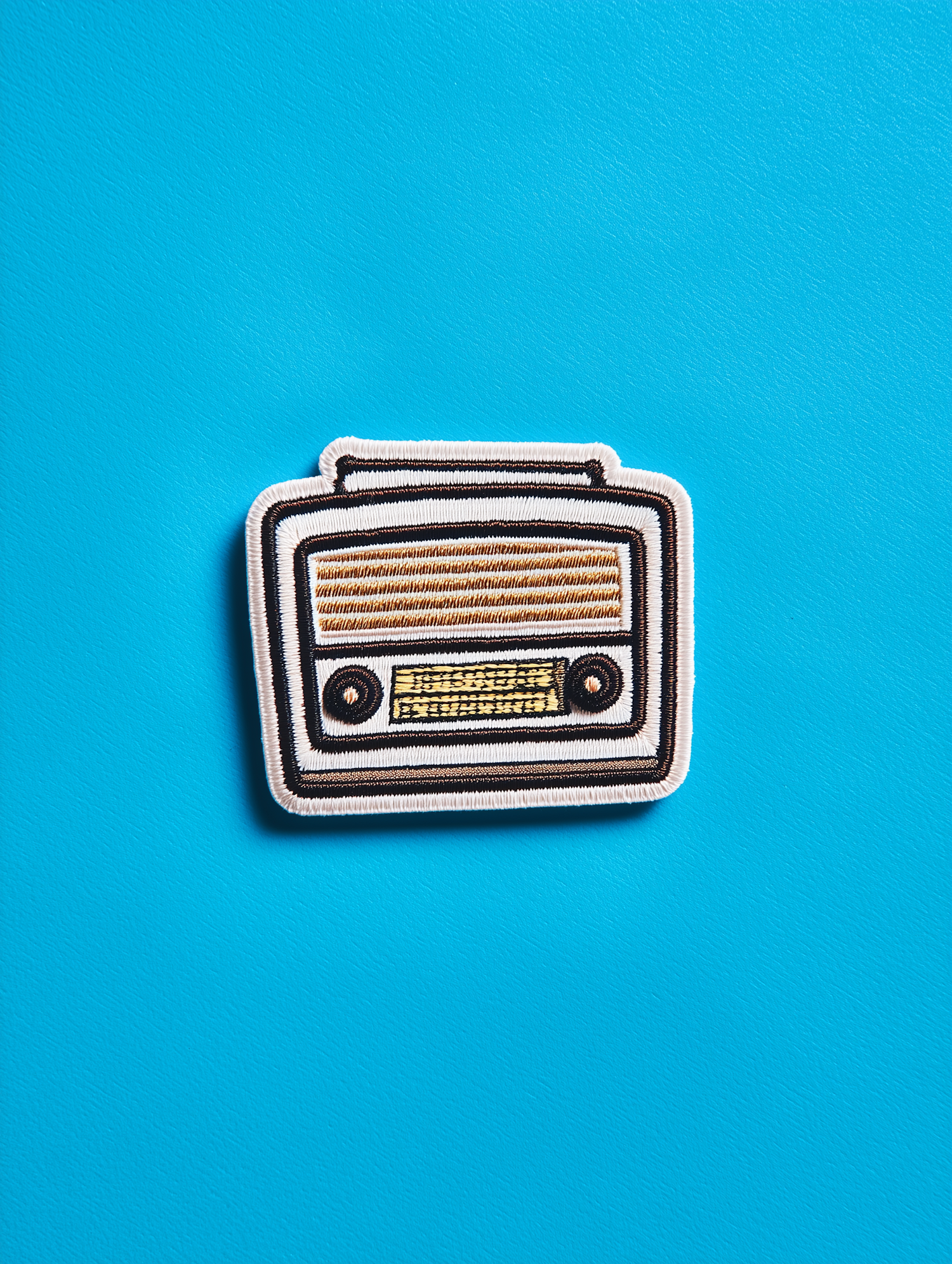 A detailed embroidered patch of a vintage radio on a vibrant blue background, showcasing intricate stitching and retro design.