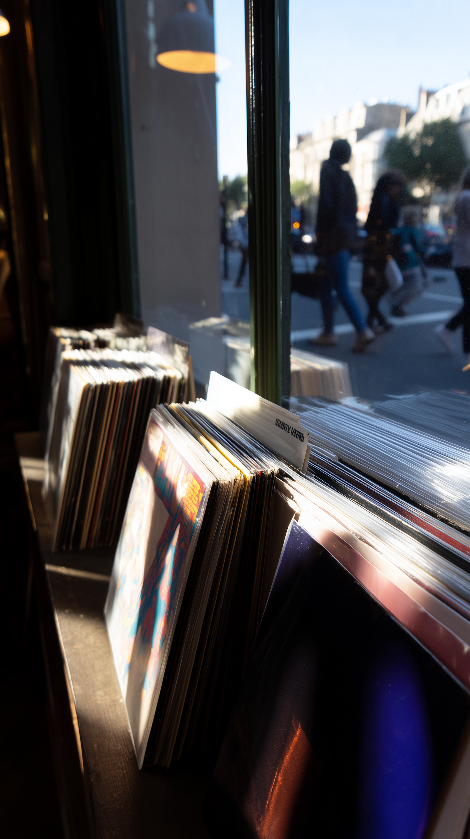 Sunlit vinyl records on a wooden shelf by a window, with blurred pedestrians outside, creating a nostalgic record store vibe.