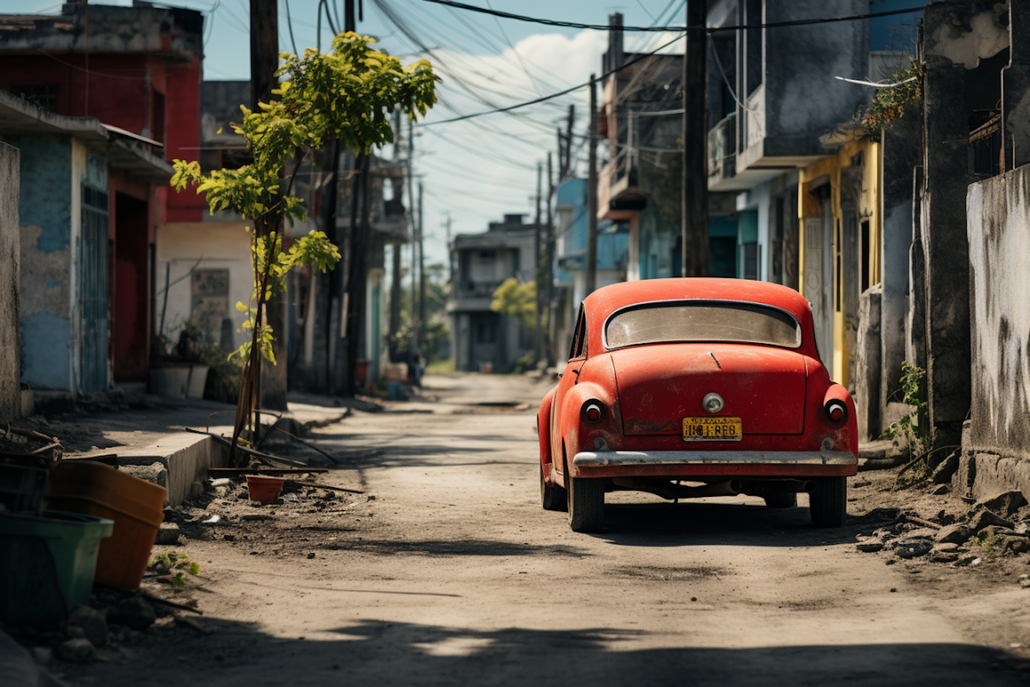 Vintage red car on a dusty street with colorful, weathered buildings and overhead power lines, evoking nostalgia and timelessness.