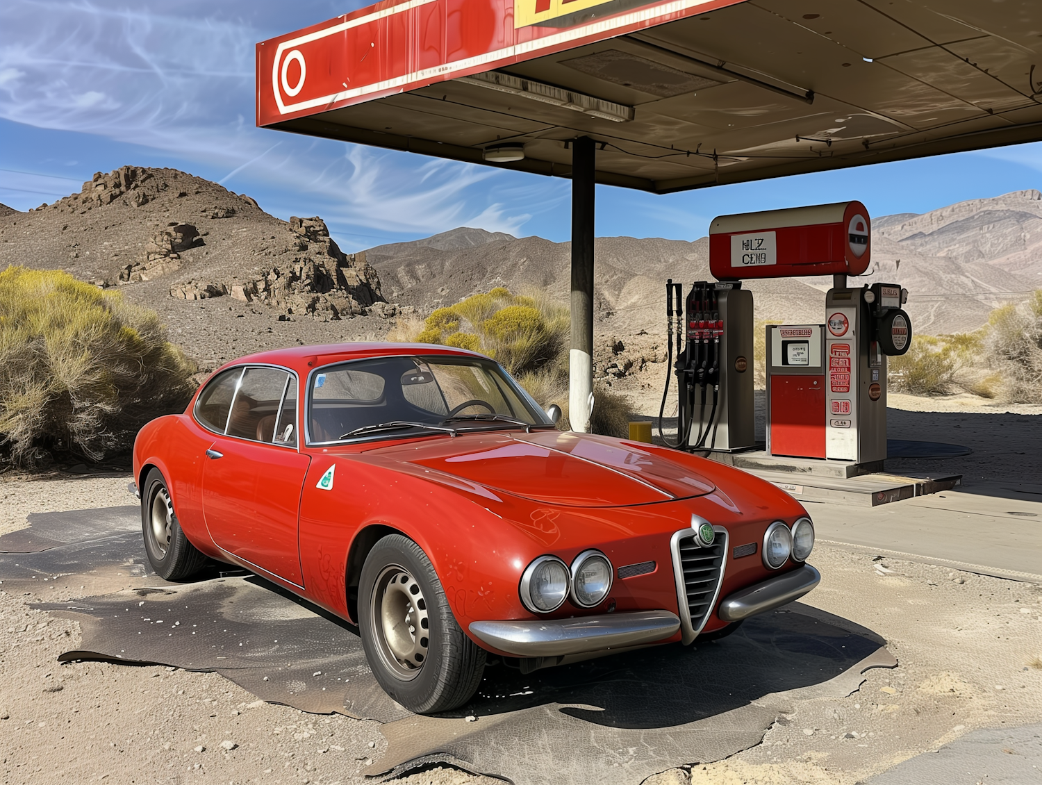 Vintage red Alfa Romeo at a retro gas station in a desert landscape, evoking nostalgia and adventure under a clear blue sky.