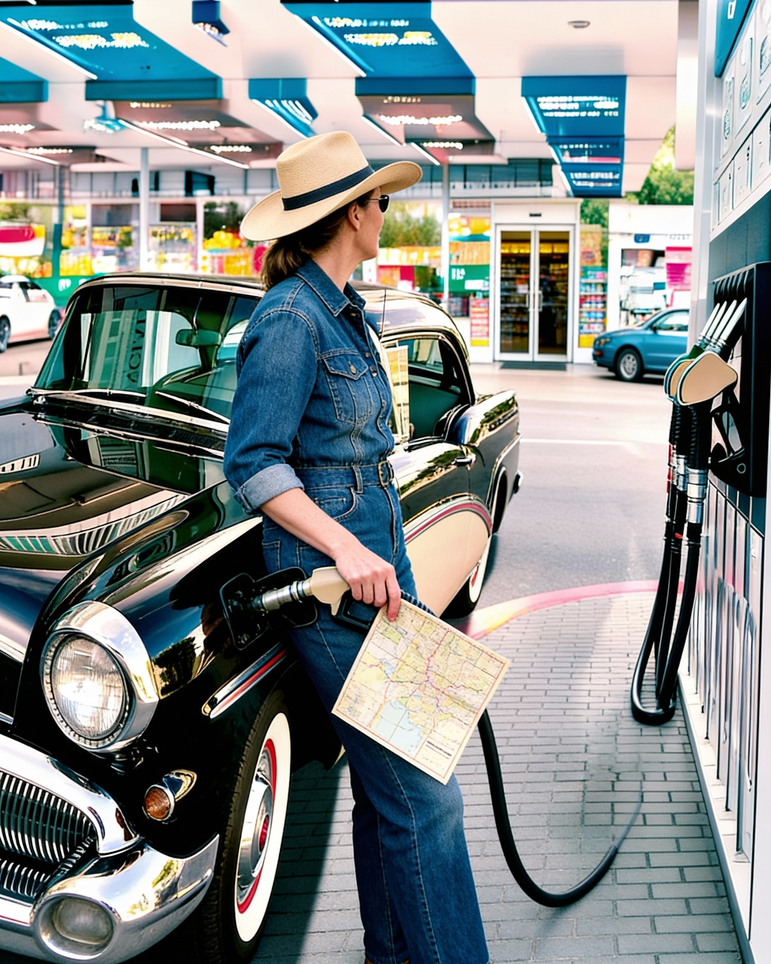 A woman in a denim outfit refuels a vintage car at a gas station, holding a map, suggesting a classic road trip vibe.
