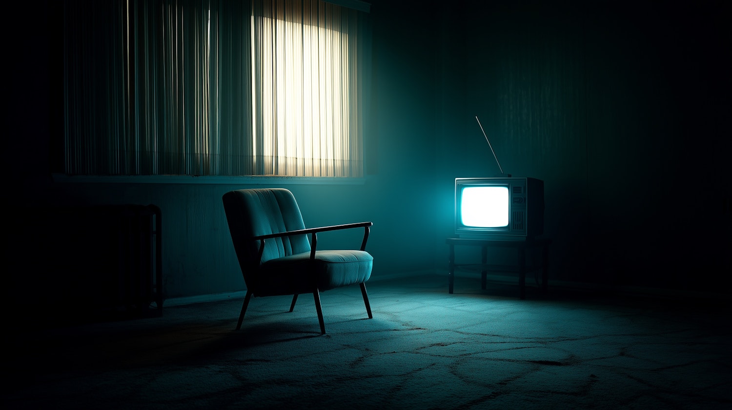 A retro TV glows in a dim room with a teal armchair and sheer curtains, evoking a nostalgic and moody atmosphere.