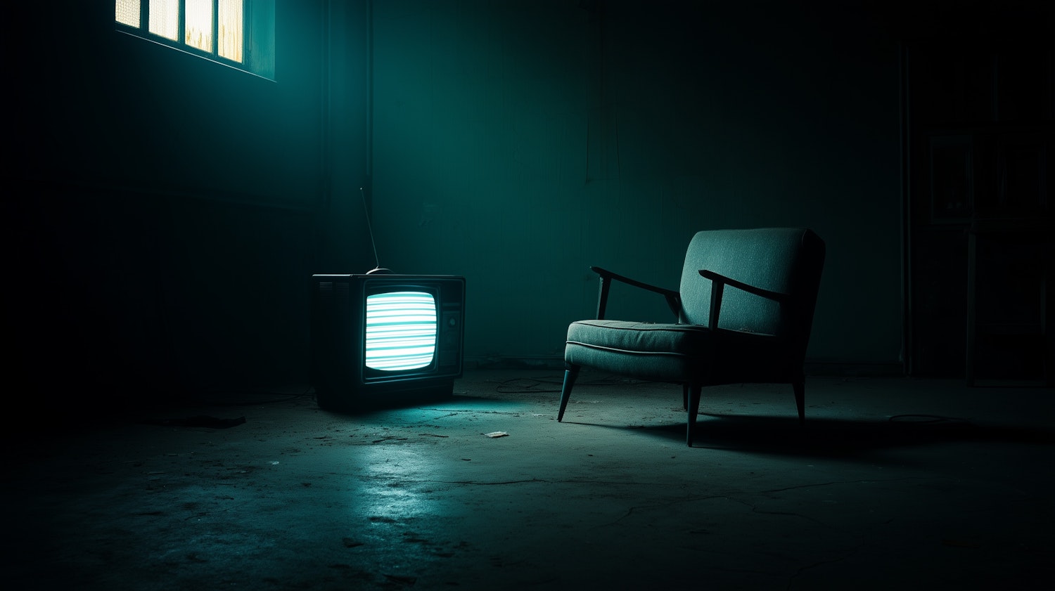 A retro TV with glowing static and a teal armchair in a dimly lit, moody room with cracked floors and faint window light.