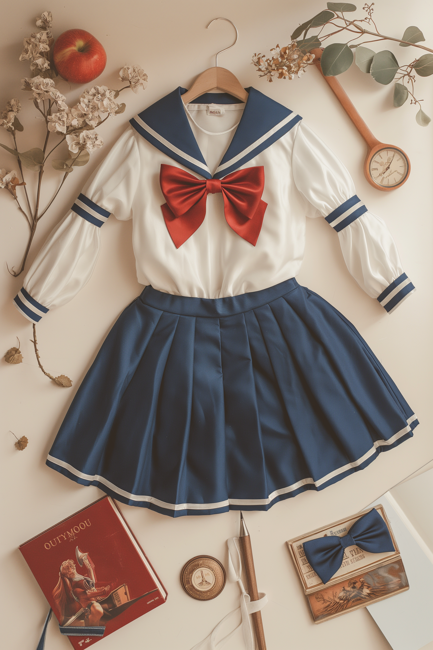 Flat lay of a Japanese schoolgirl uniform with a red bow, surrounded by vintage items like a clock, book, and apple.