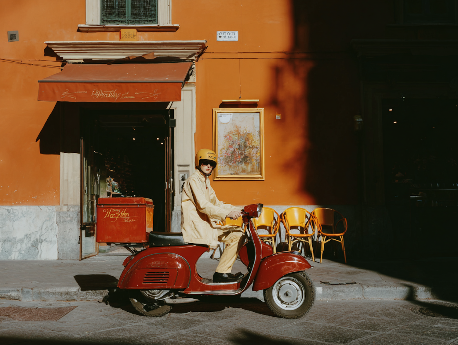 A person on a red vintage scooter in front of an orange building with a café and yellow chairs, bathed in warm sunlight.