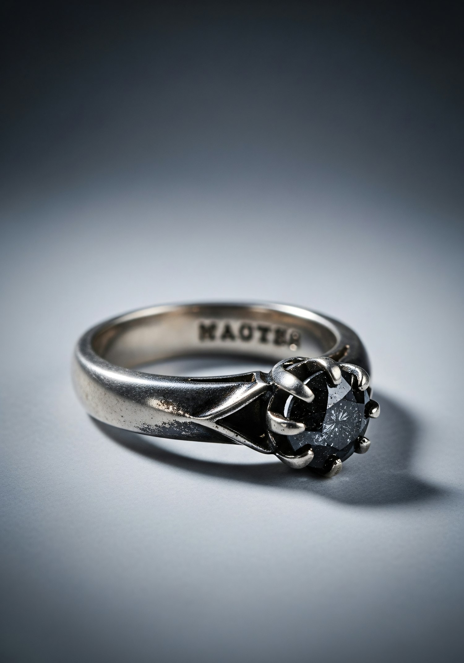 A silver ring with a dark gemstone in a claw setting, featuring a vintage look with a tarnished band and engraved details.