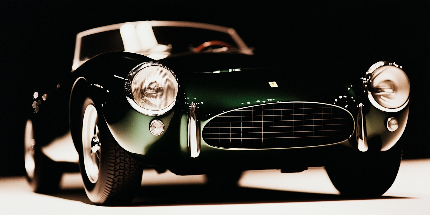 Close-up of a vintage dark green sports car with chrome accents, round headlights, and a glossy finish against a dark background.