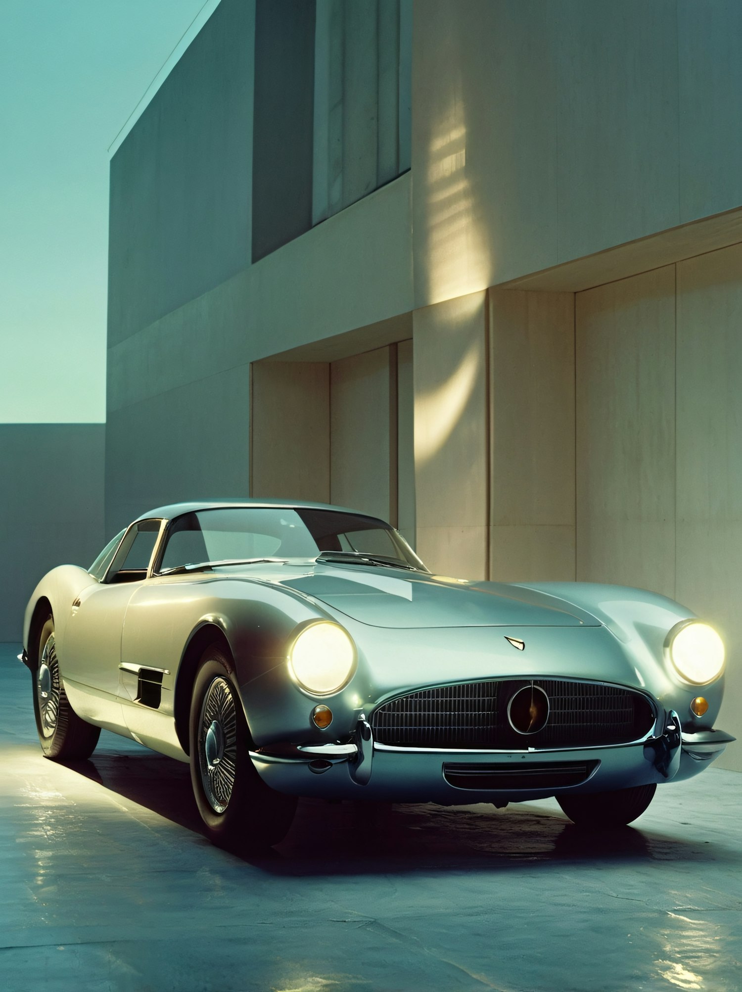 A vintage silver-blue car with illuminated headlights parked by a modern beige building, showcasing retro elegance and sleek design.