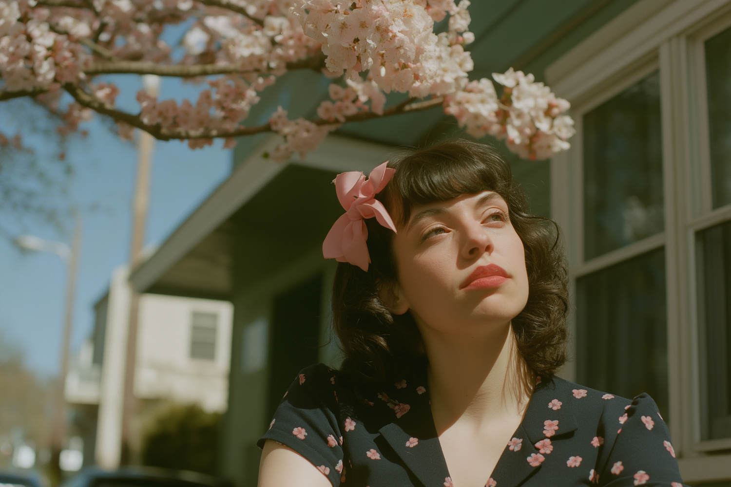 A thoughtful woman in a floral dress and pink bow under cherry blossoms, bathed in soft sunlight with a nostalgic spring vibe.