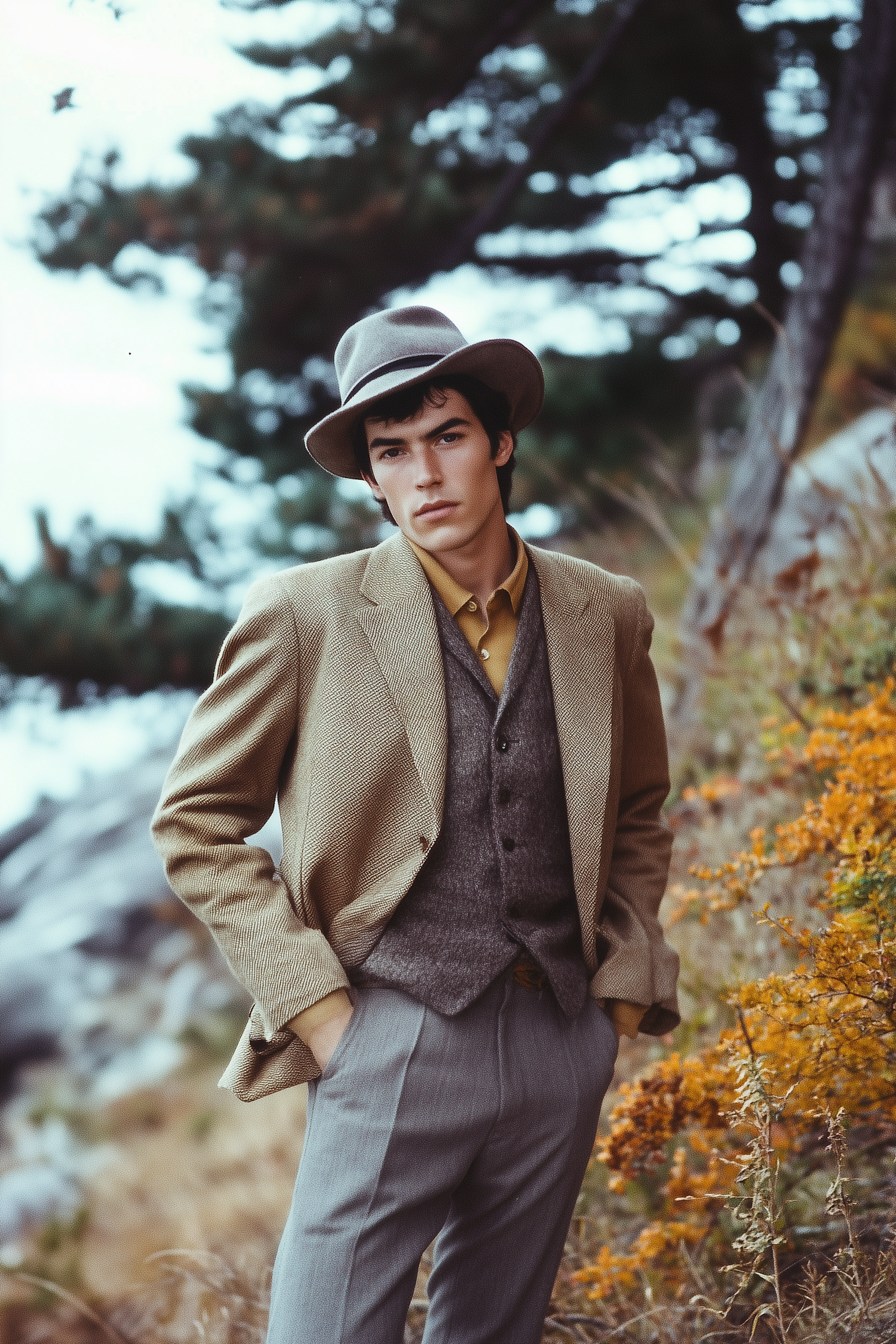 Stylish young man in vintage-inspired outfit with blazer, vest, and fedora, set against a rustic autumnal outdoor backdrop.
