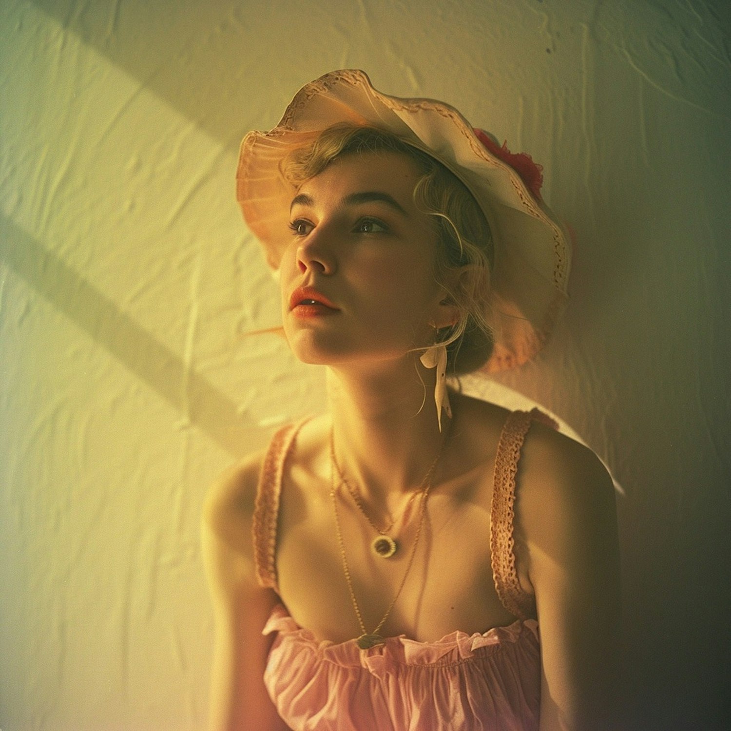 A person in a pink ruffled top and wide-brimmed hat sits in warm lighting, with a blurred face and elegant necklace.