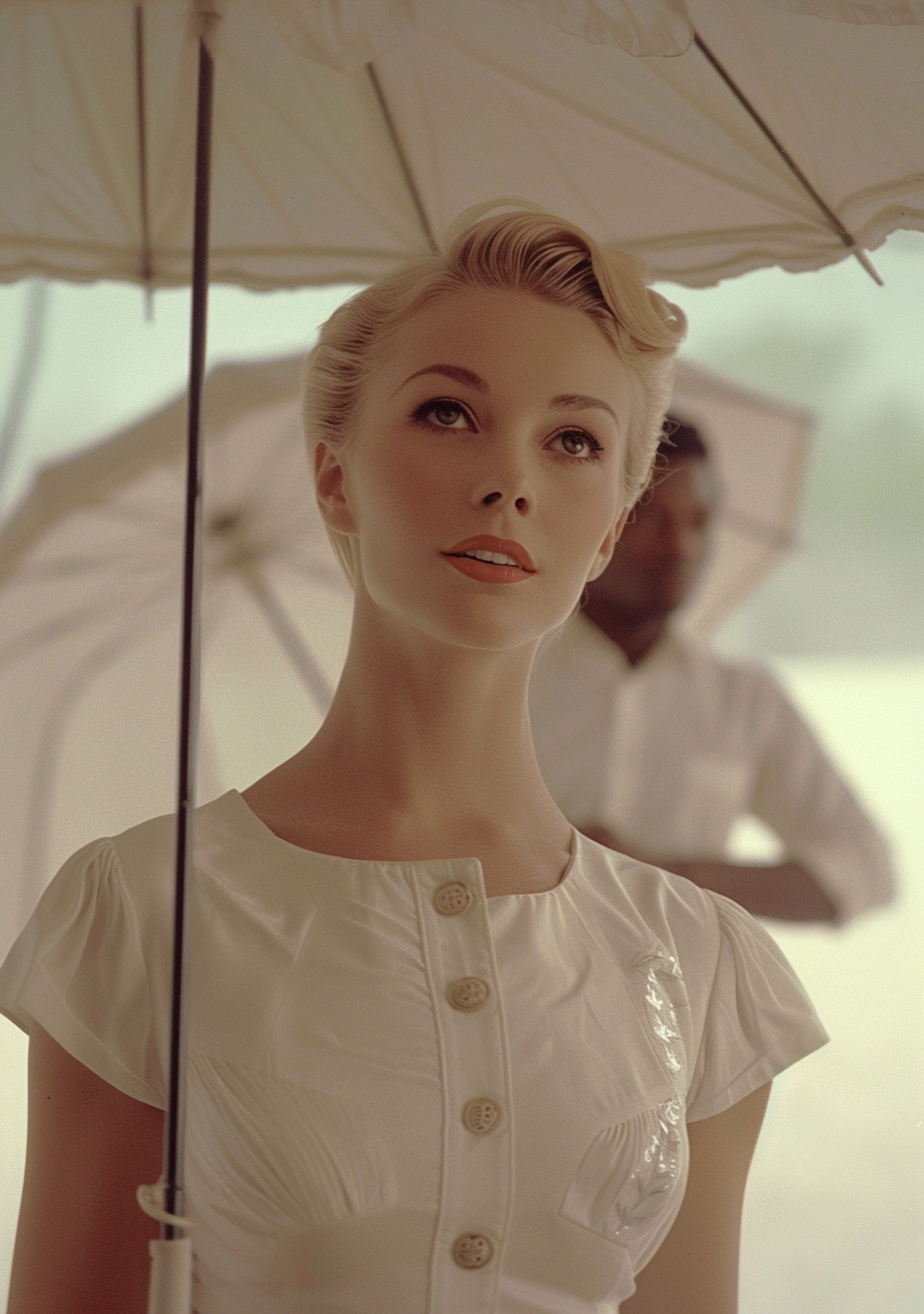 Elegant woman in vintage white dress under parasol, serene expression, dreamy atmosphere with soft lighting and muted colors.