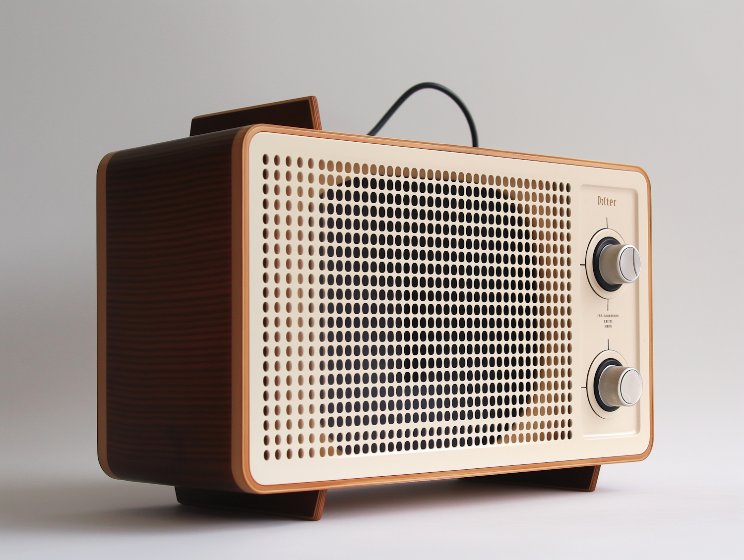 Vintage-style radio with wooden casing, cream front panel, and metallic knobs. Retro design with modern elements, set against a gray background.