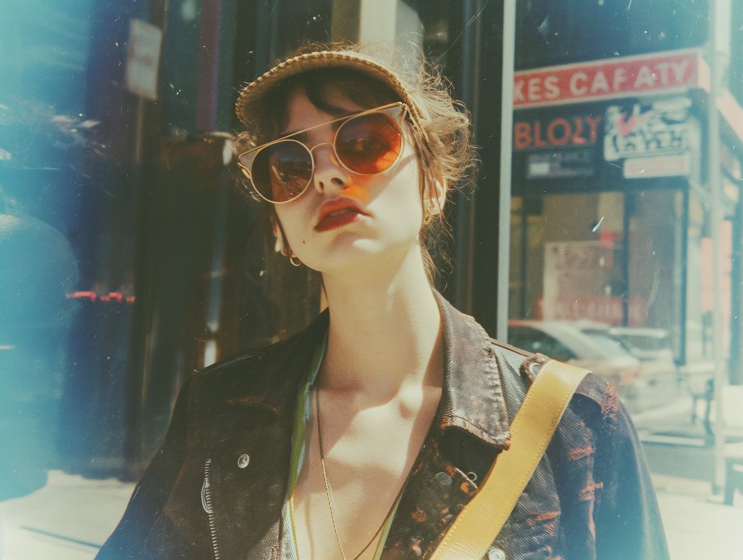Stylish woman in sunglasses and leather jacket in urban setting with vintage vibe.