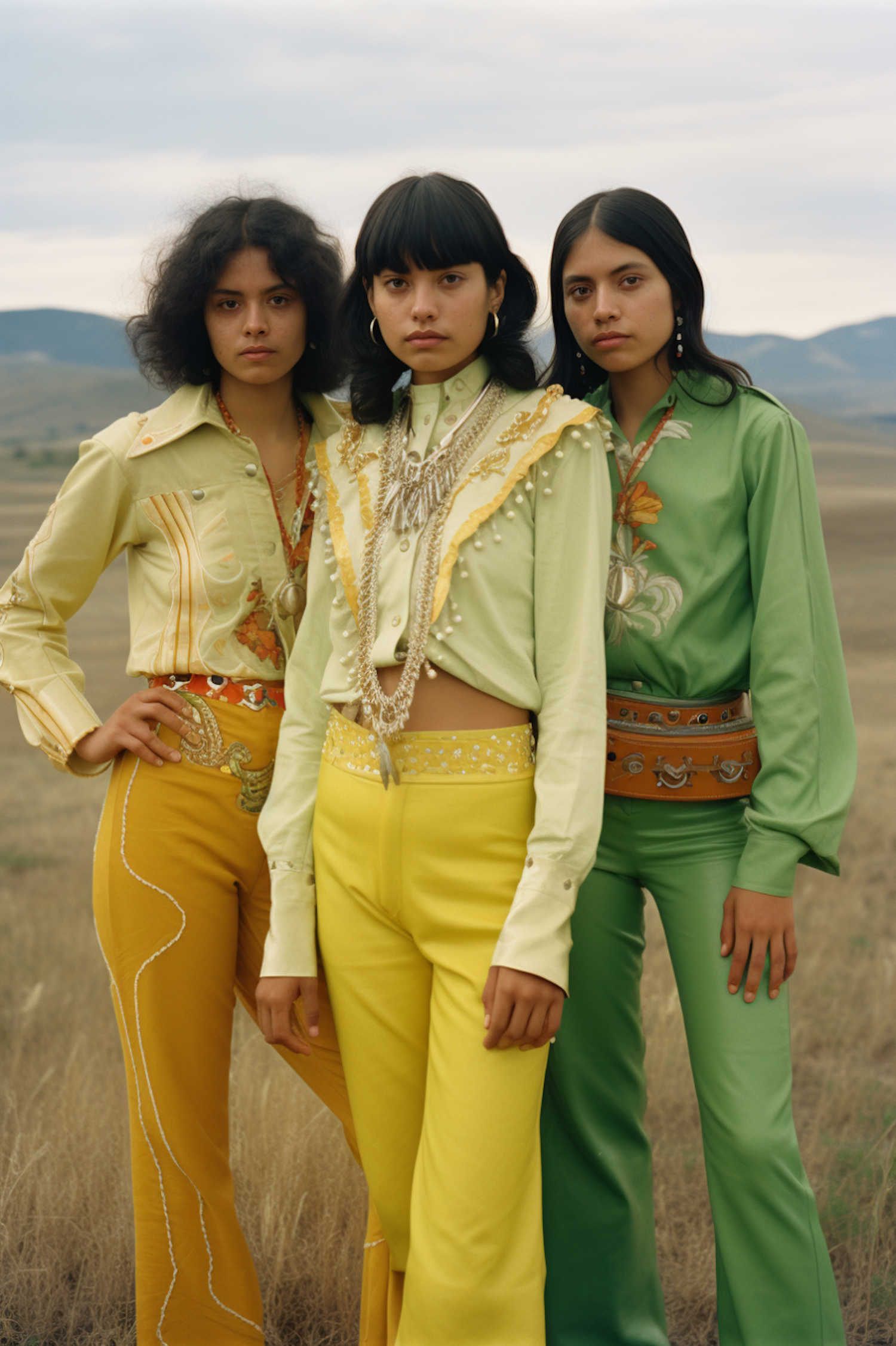 Three women in vibrant retro outfits stand in a field, exuding confidence and unity against a backdrop of rolling hills.