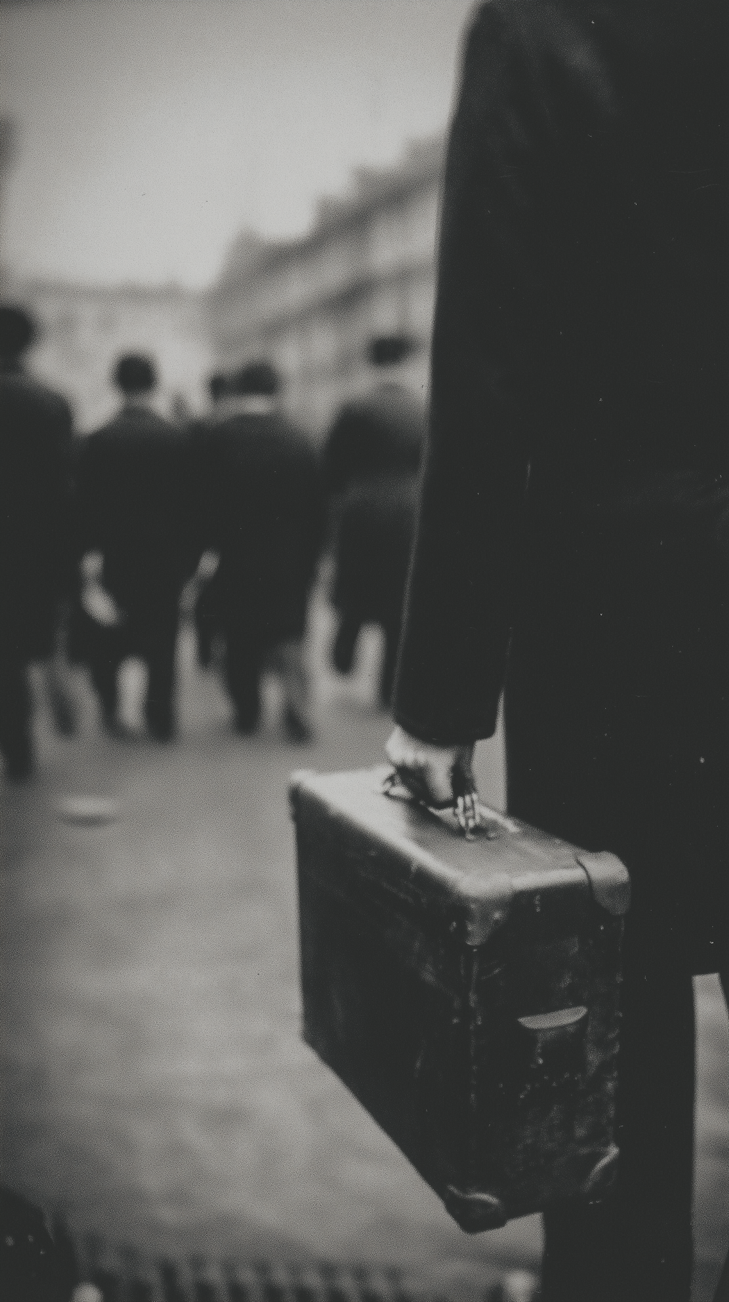 An evocative black-and-white photo of a person holding a vintage suitcase, with blurred figures walking in a street setting.