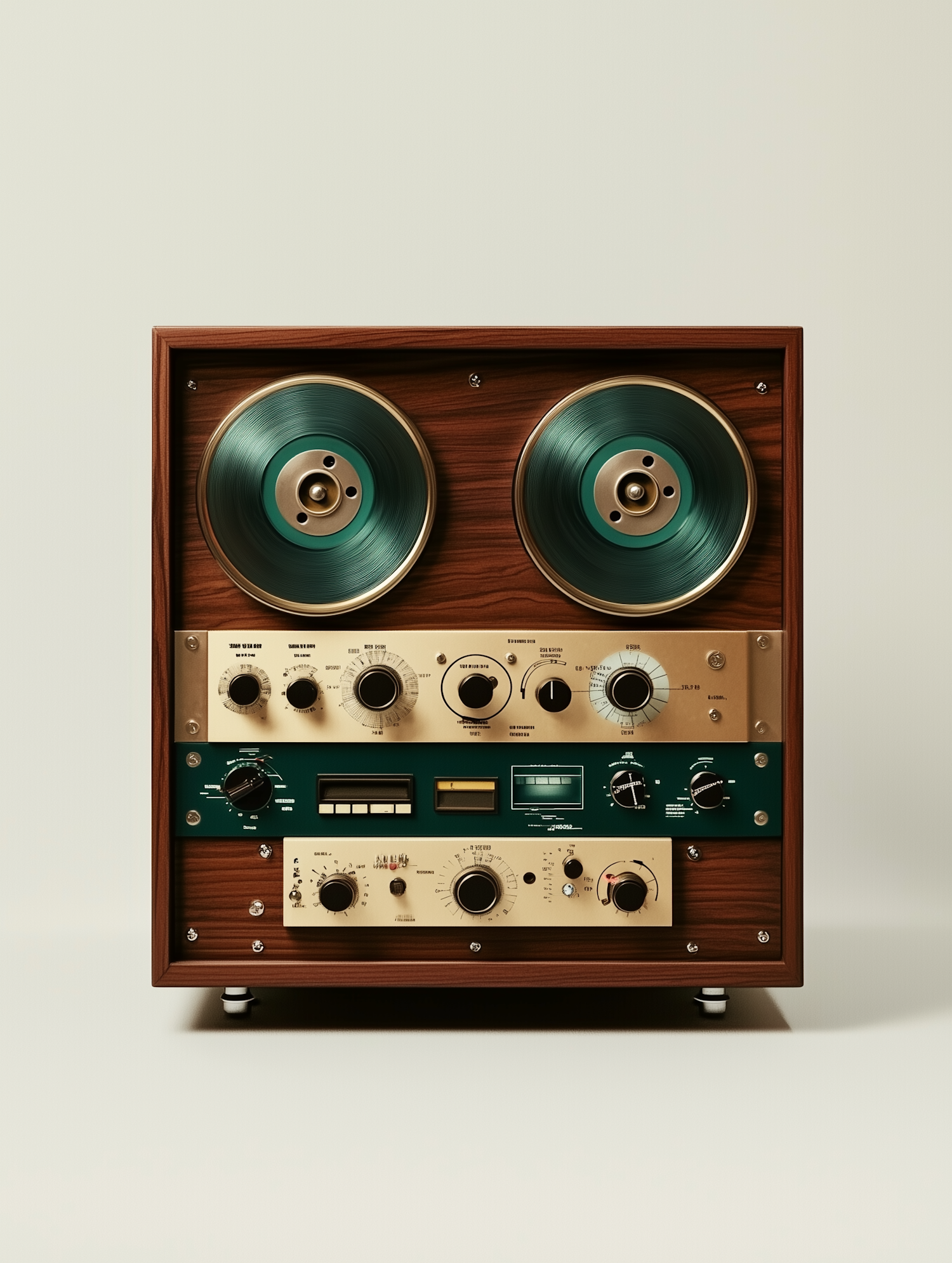 Retro reel-to-reel tape recorder with green reels, gold accents, and a polished wooden casing. Perfect for vintage audio enthusiasts.