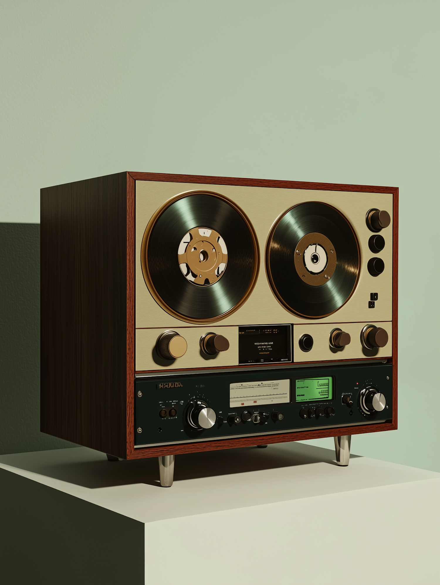 Retro reel-to-reel tape recorder with golden reels, wooden frame, and analog dials on a white pedestal against a green backdrop.