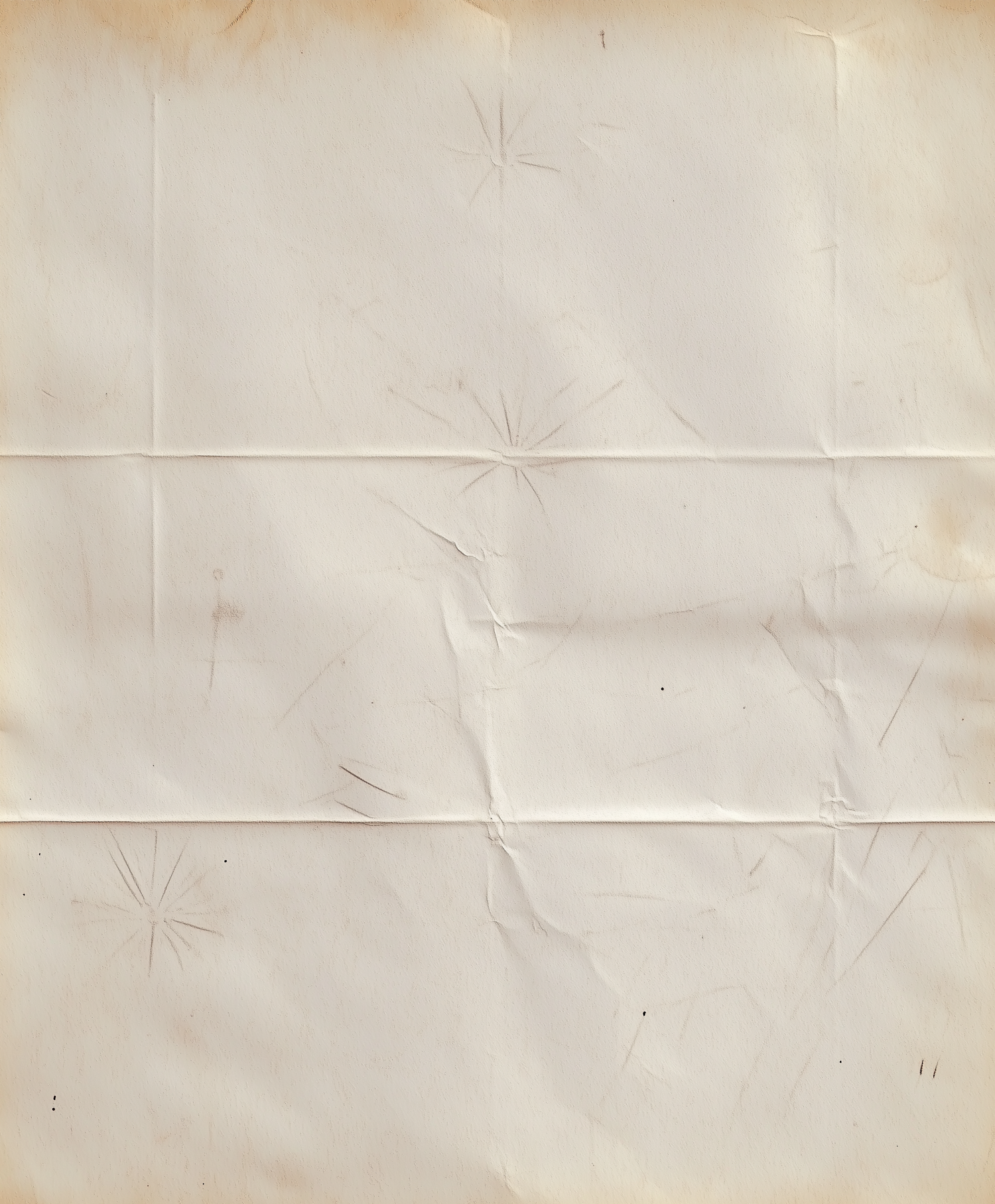 A vintage, creased paper with a yellowish tint, faint starburst marks, and weathered edges, perfect for antique or rustic design projects.