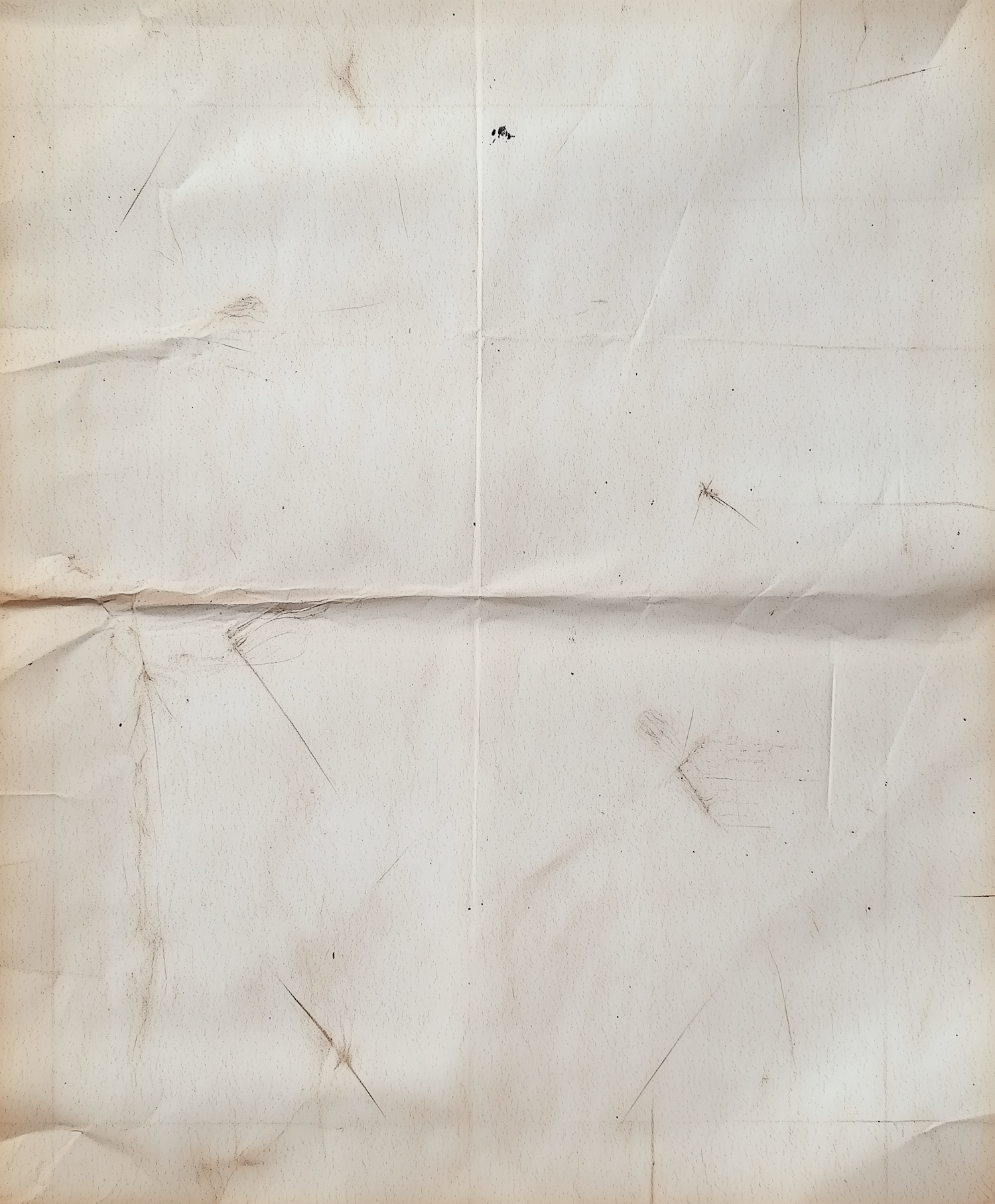 A vintage, creased paper with yellowed tones, scratches, and smudges, perfect for use as a textured background or design element.