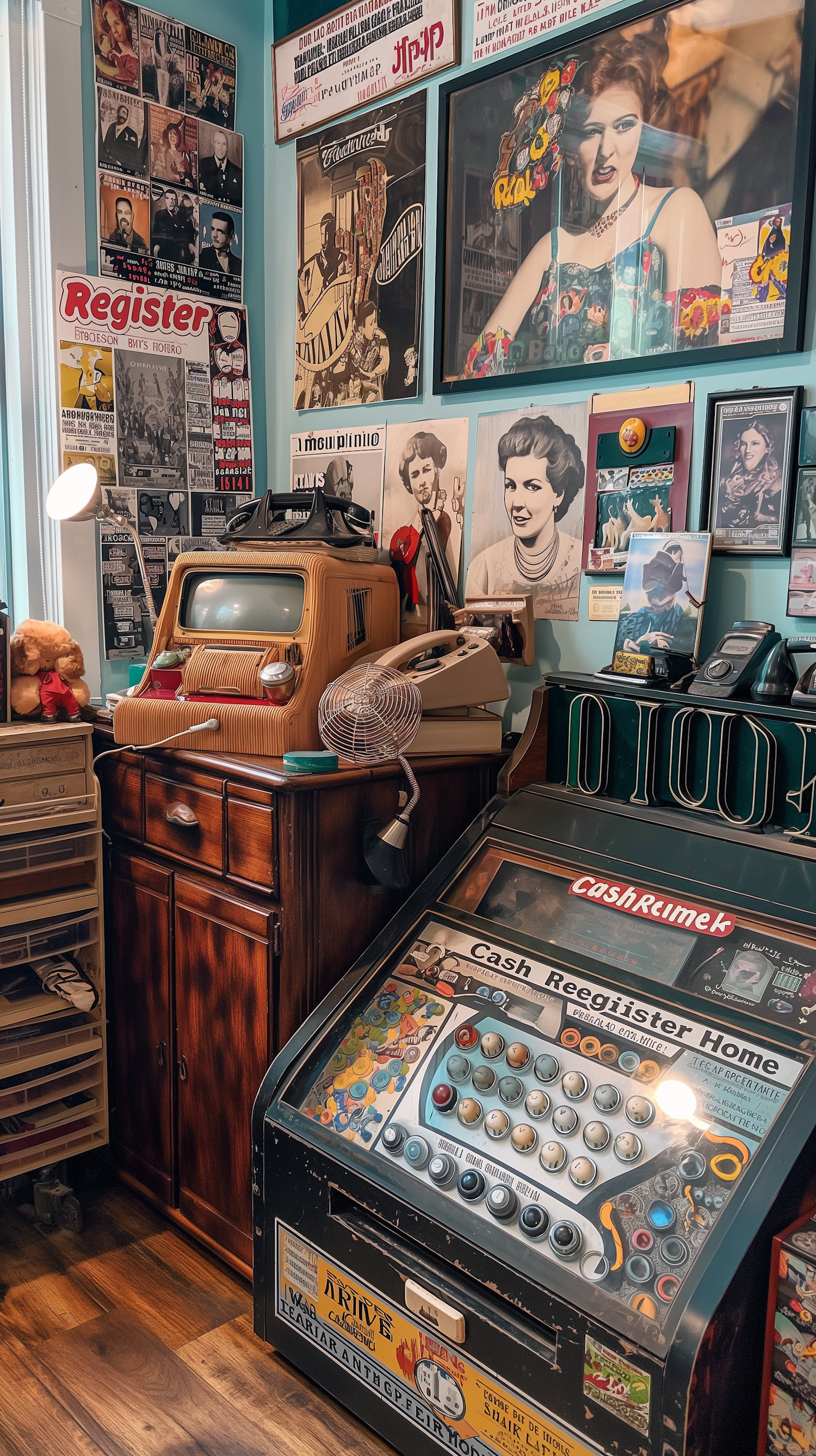 Vintage room with retro cash register, old TV, and nostalgic posters. Cozy atmosphere with warm lighting and wooden decor.