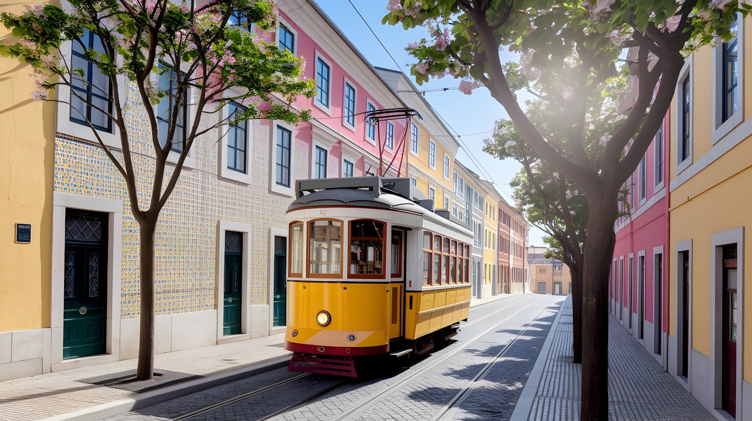 Charming yellow tram on a pastel-colored street with cobblestones, blooming trees, and intricate tiled facades under sunny skies.