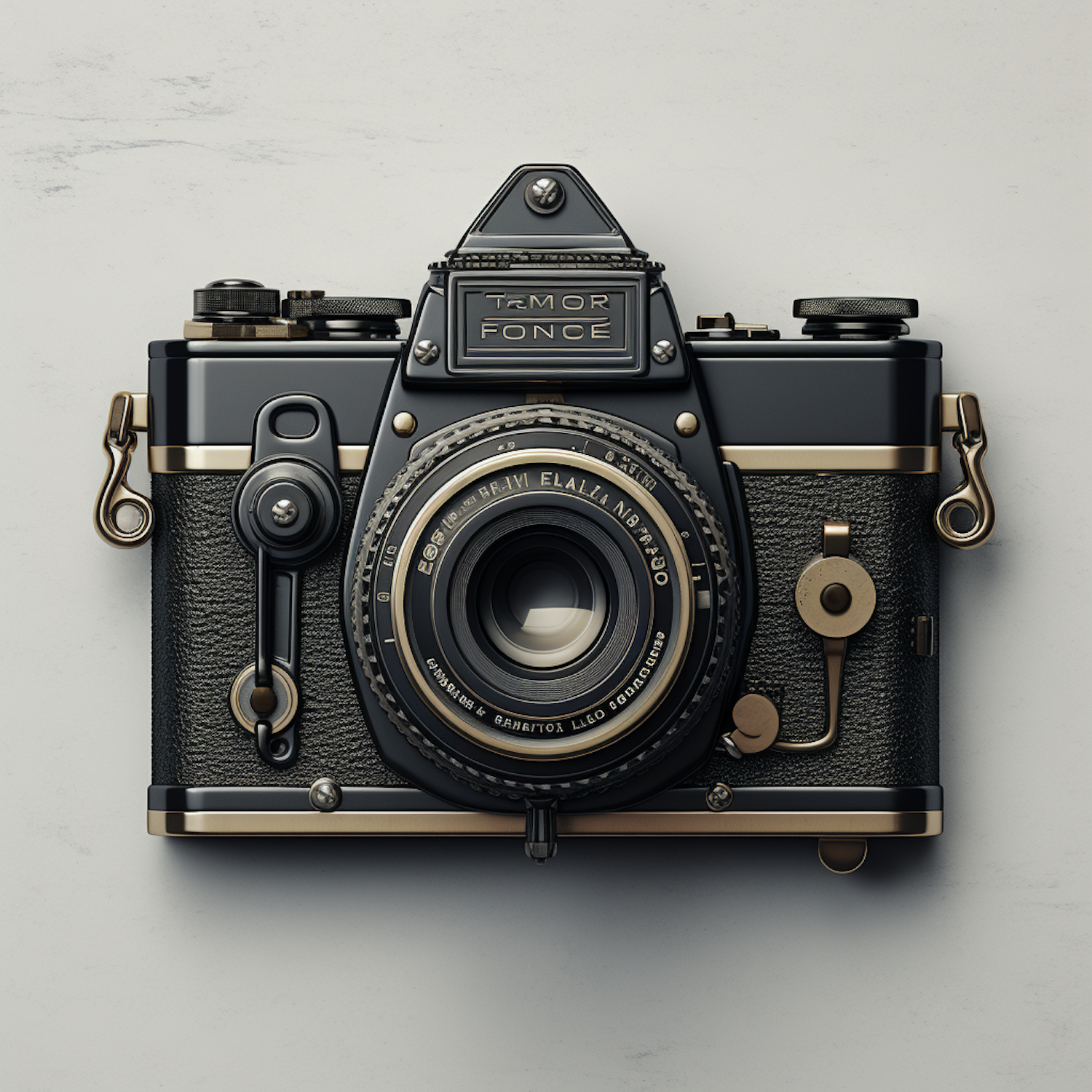 Vintage-style camera with textured black body, metallic accents, and intricate lens detailing. Elegant and sophisticated design.