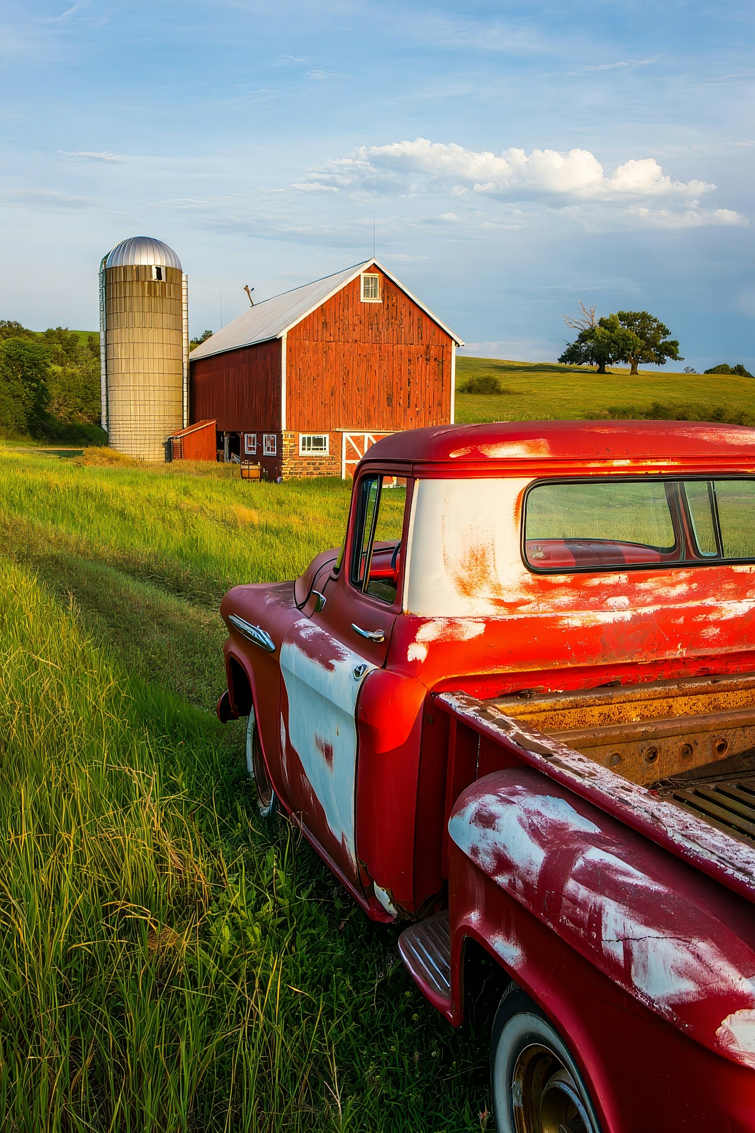 Rustic red barn and vintage truck in a sunny countryside setting, with a silo and rolling green hills in the background.