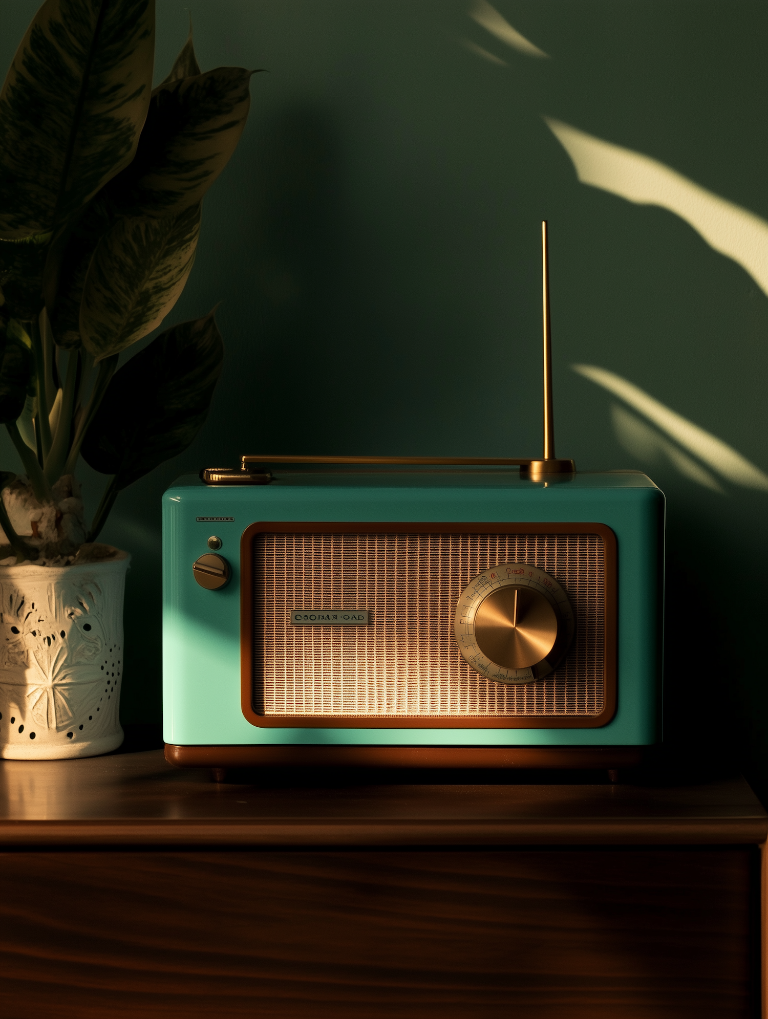 Retro turquoise radio with gold accents on a wooden table, paired with a leafy plant in a white pot, bathed in warm sunlight.