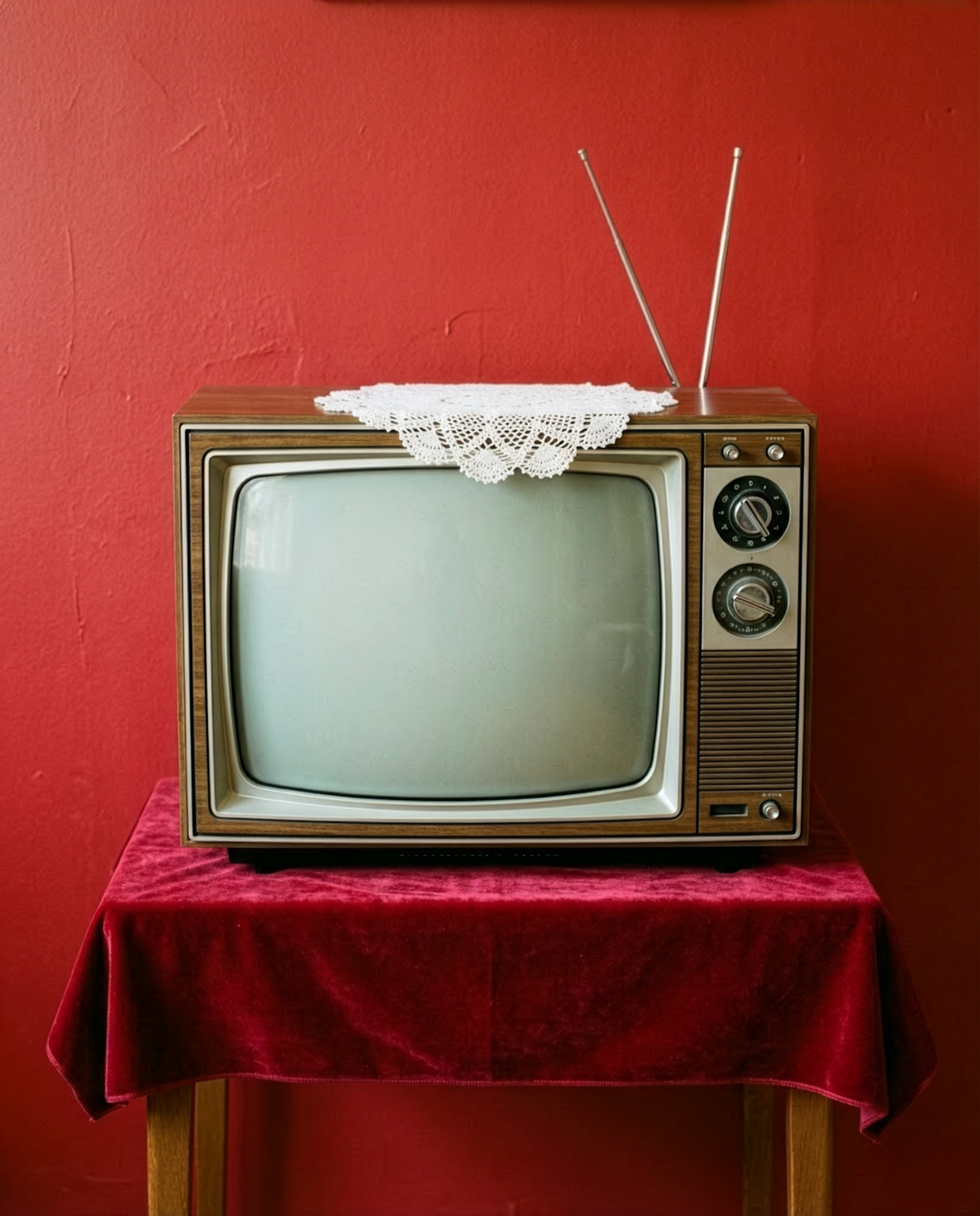 A retro TV with a wooden frame and lace doily on a red velvet tablecloth, set against a red wall for a nostalgic vibe.