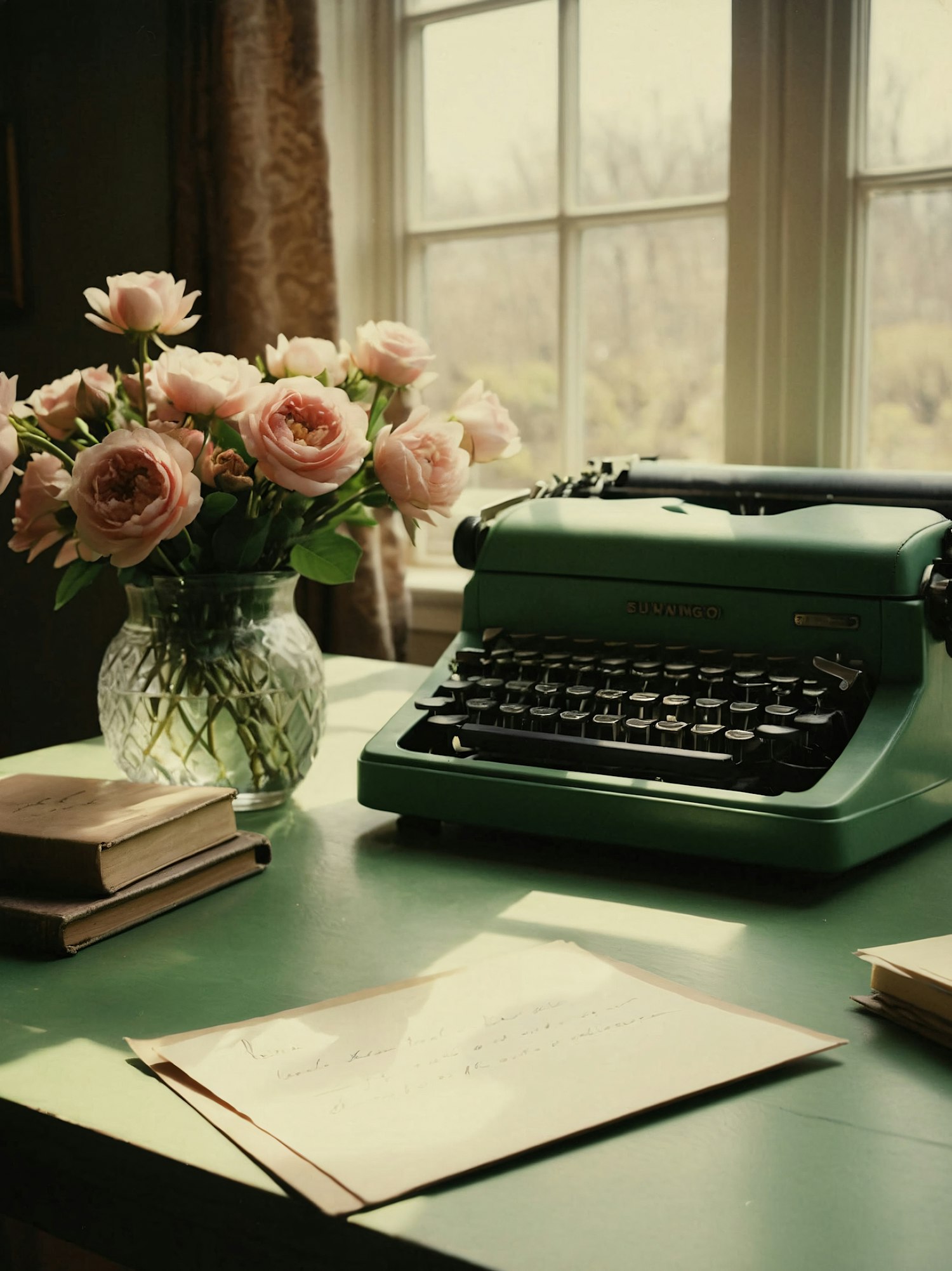 Vintage green typewriter on a desk with pink roses in a vase, books, and handwritten paper, creating a nostalgic and serene scene.
