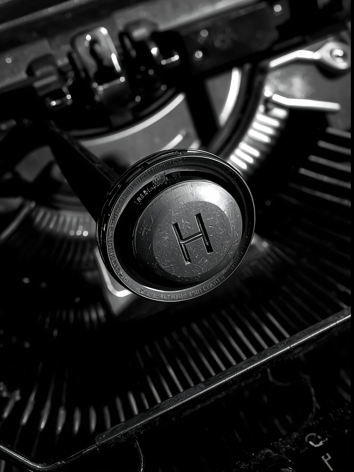 Close-up of a vintage typewriter's 'H' key in black and white, showcasing intricate details and a nostalgic, industrial aesthetic.
