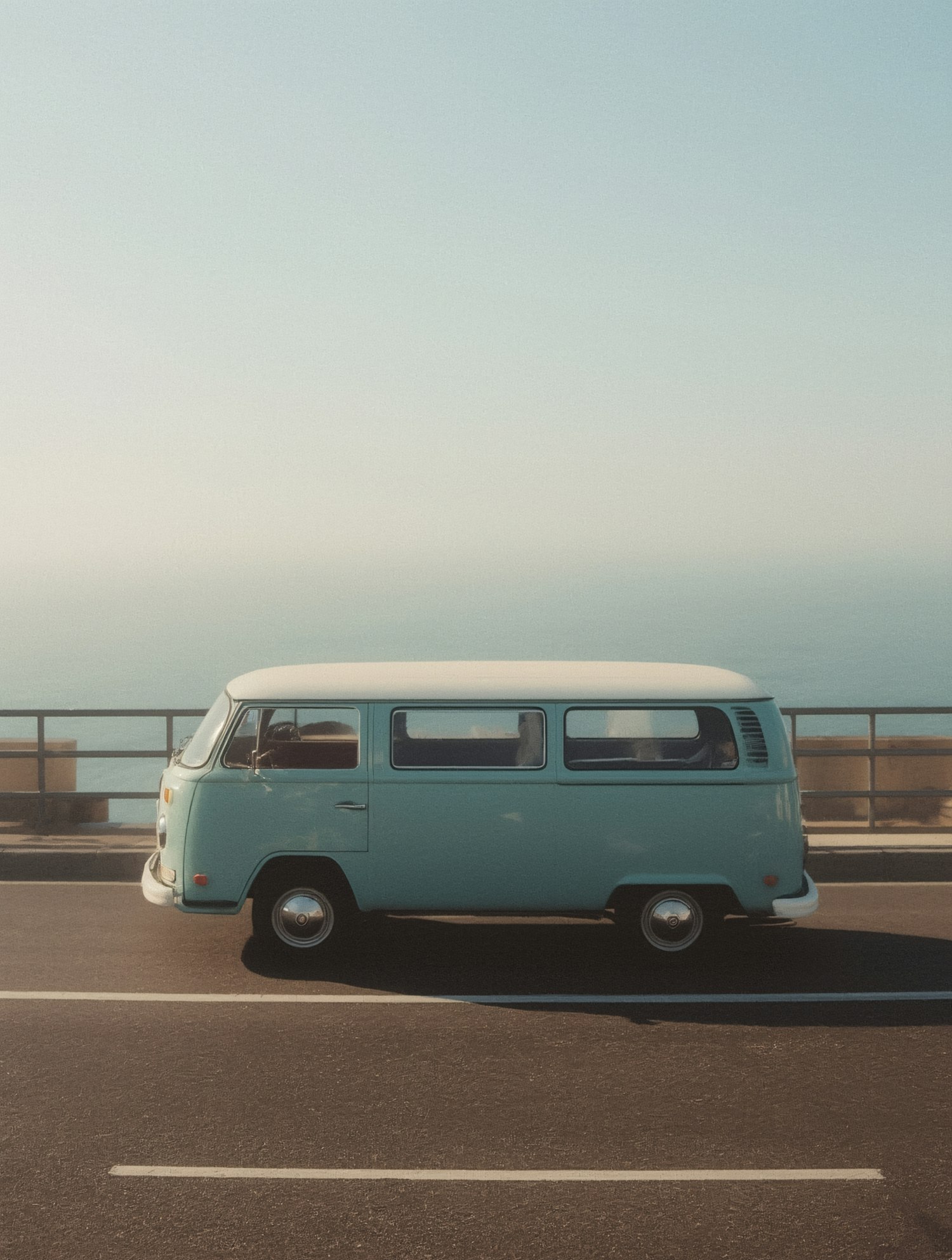 A retro light blue van parked on a coastal road with a serene ocean backdrop under a clear blue sky.