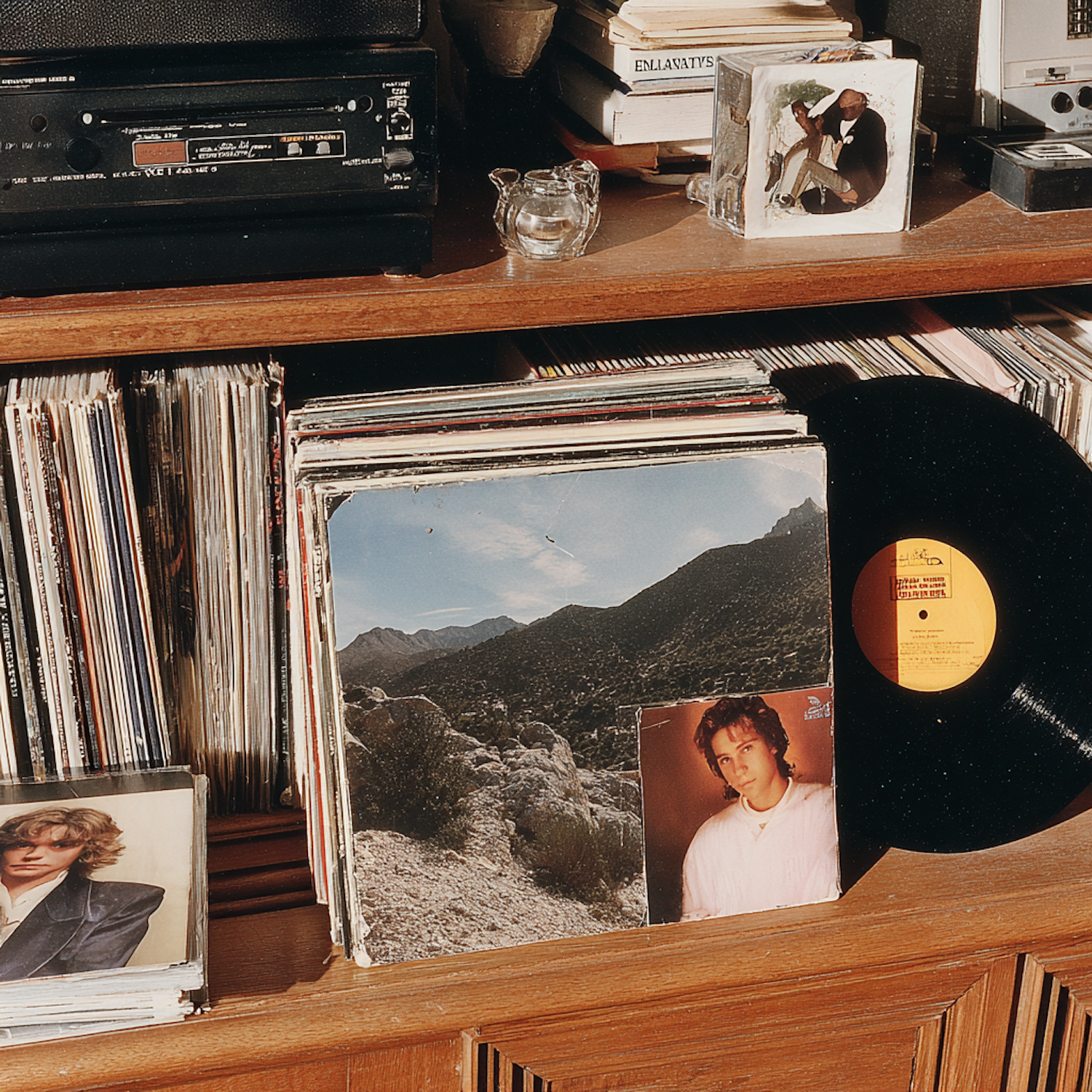 A cozy shelf with vinyl records, a cassette player, and nostalgic decor, perfect for music lovers and vintage enthusiasts.