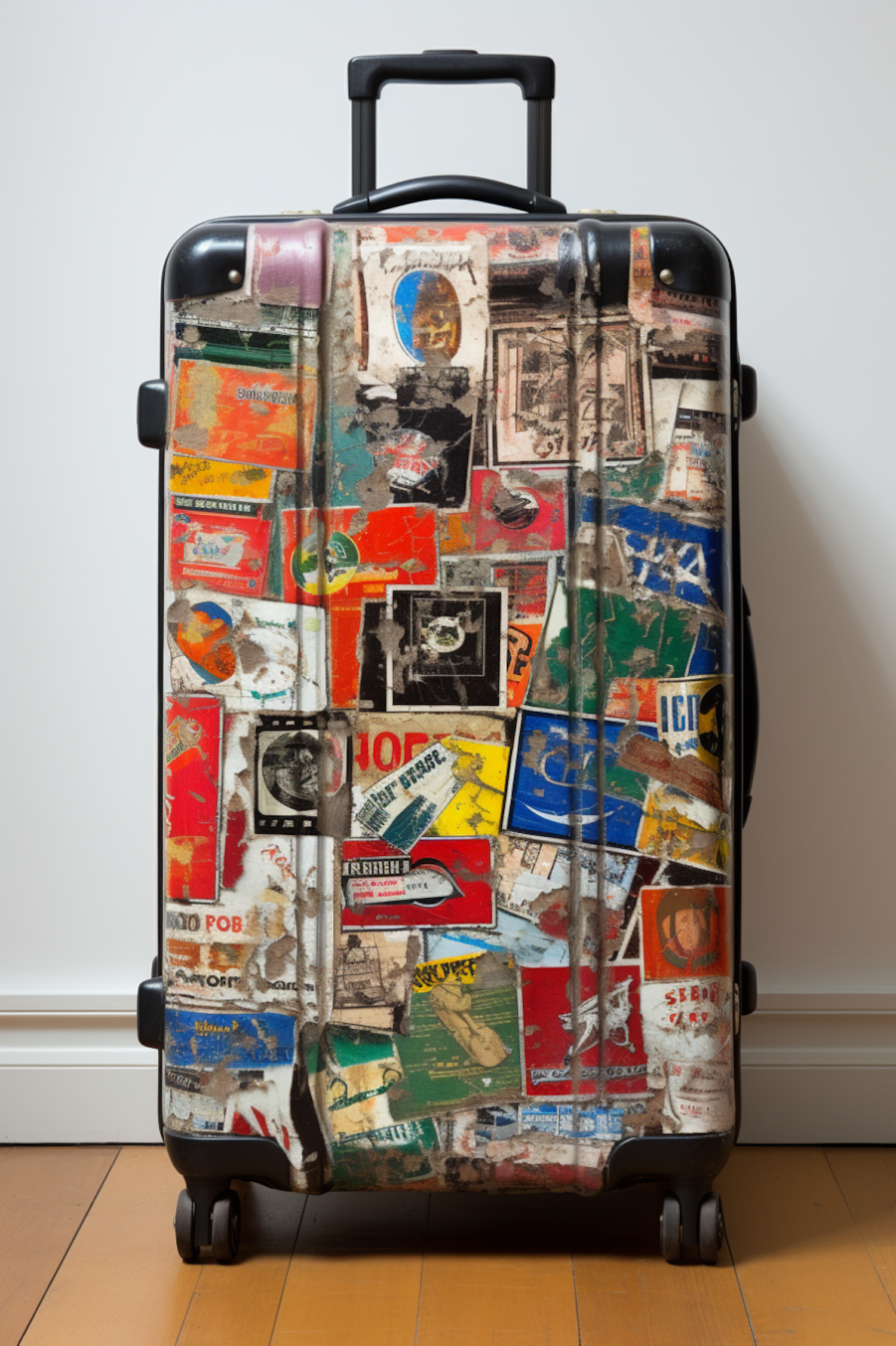 A black suitcase adorned with colorful, worn travel stickers, showcasing a history of extensive travel adventures.