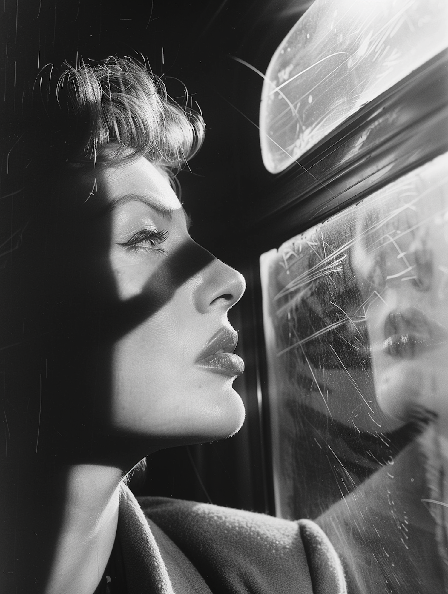 Dramatic black-and-white close-up of a woman gazing out a scratched window, with vintage lighting and a nostalgic, mysterious vibe.