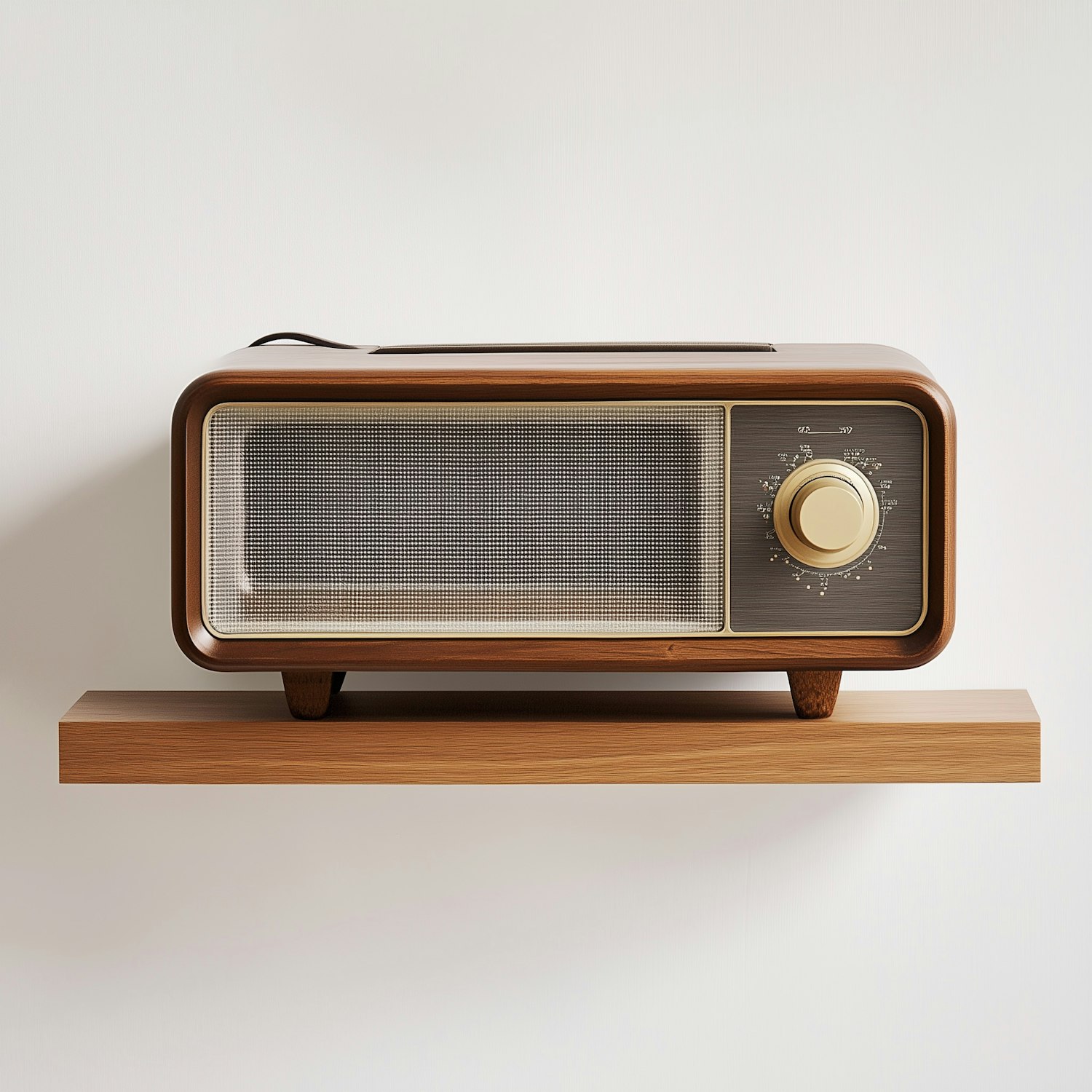Retro wooden radio with a mesh speaker and tuning knob on a minimalist wooden shelf, perfect for vintage decor inspiration.