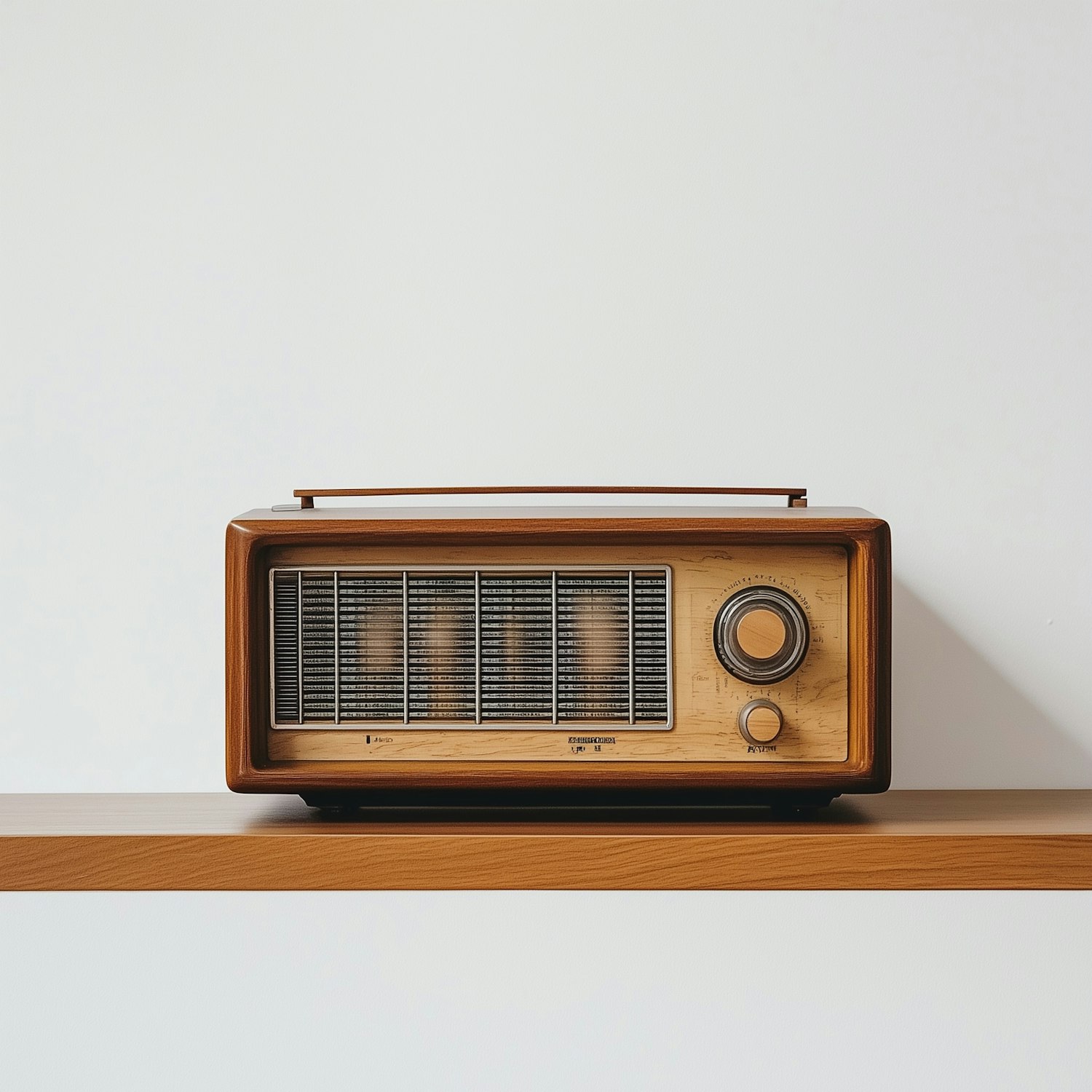 A classic wooden vintage radio on a minimalist shelf, blending retro charm with modern simplicity against a white background.