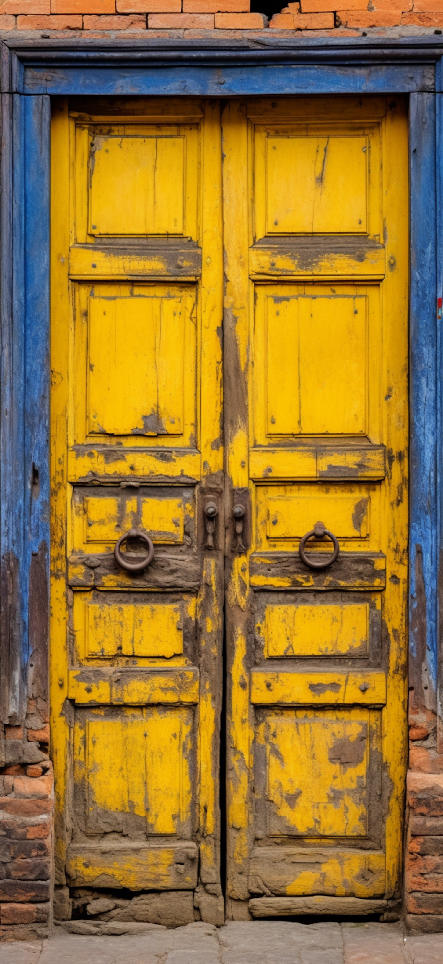 Rustic yellow wooden door with blue frame and metal handles, set in a red brick wall. Weathered and vintage charm.