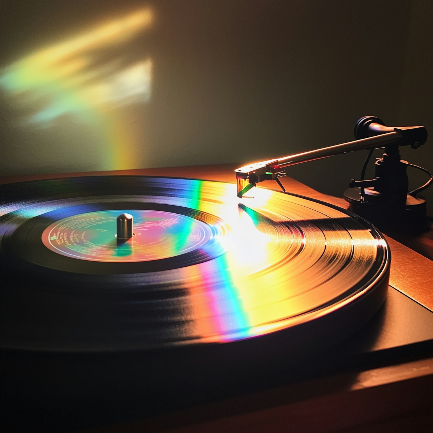 A spinning vinyl record on a turntable with a rainbow reflection, highlighting the beauty of analog music and vintage aesthetics.