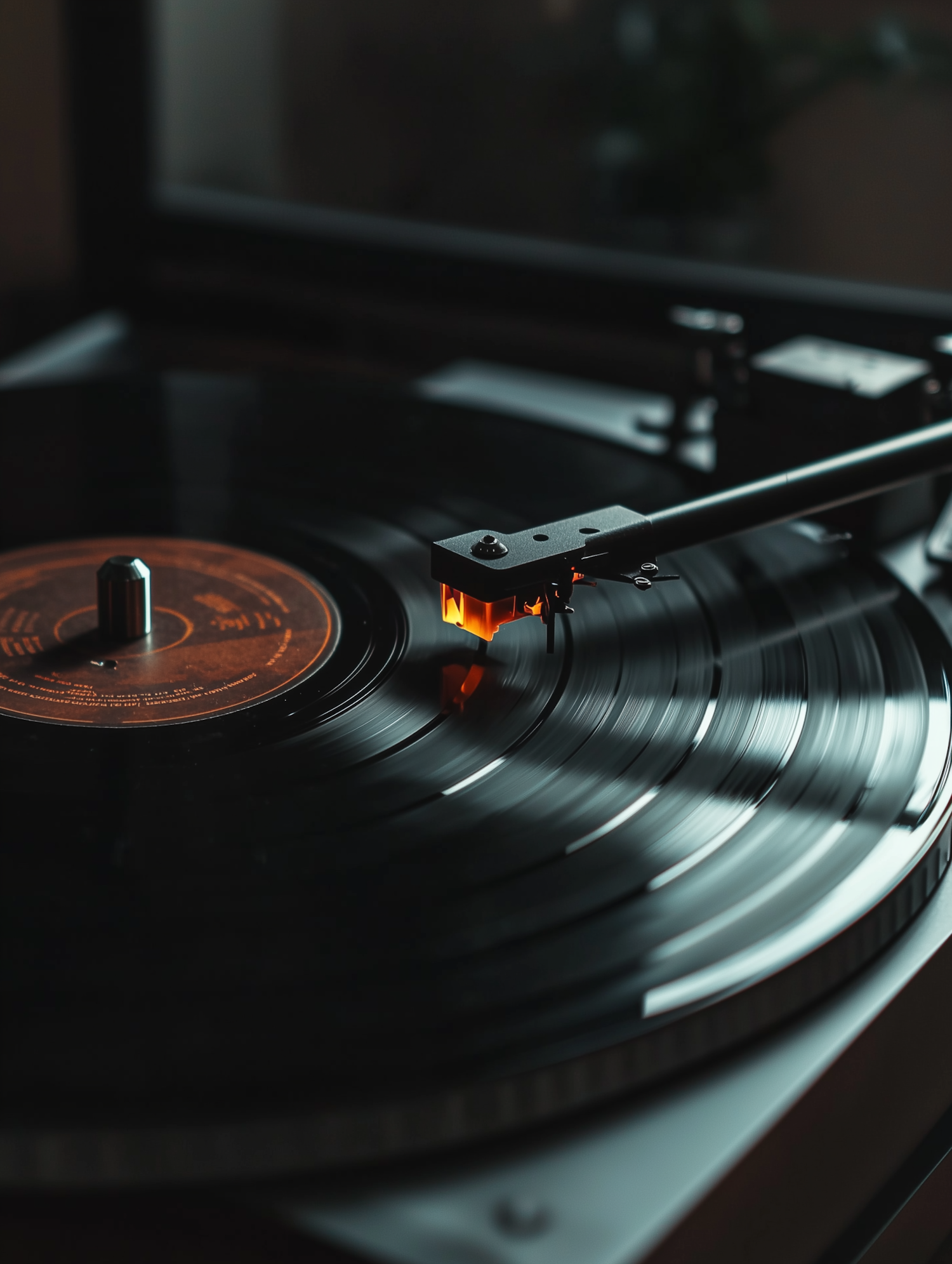 Close-up of a spinning vinyl record on a turntable with a glowing stylus, creating a nostalgic and warm ambiance.
