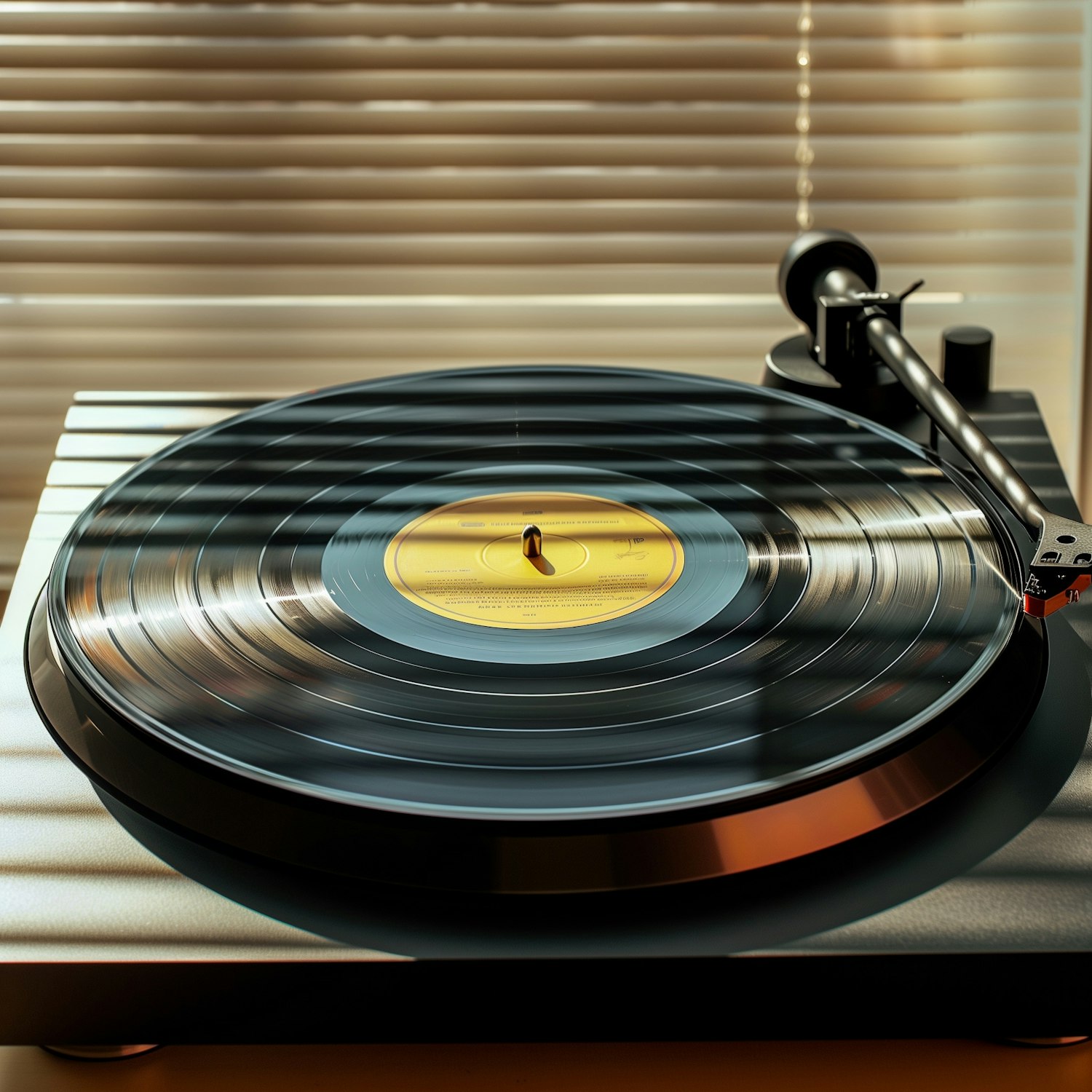 A spinning vinyl record on a sleek turntable with warm sunlight filtering through blinds in the background. Perfect retro-modern vibe.