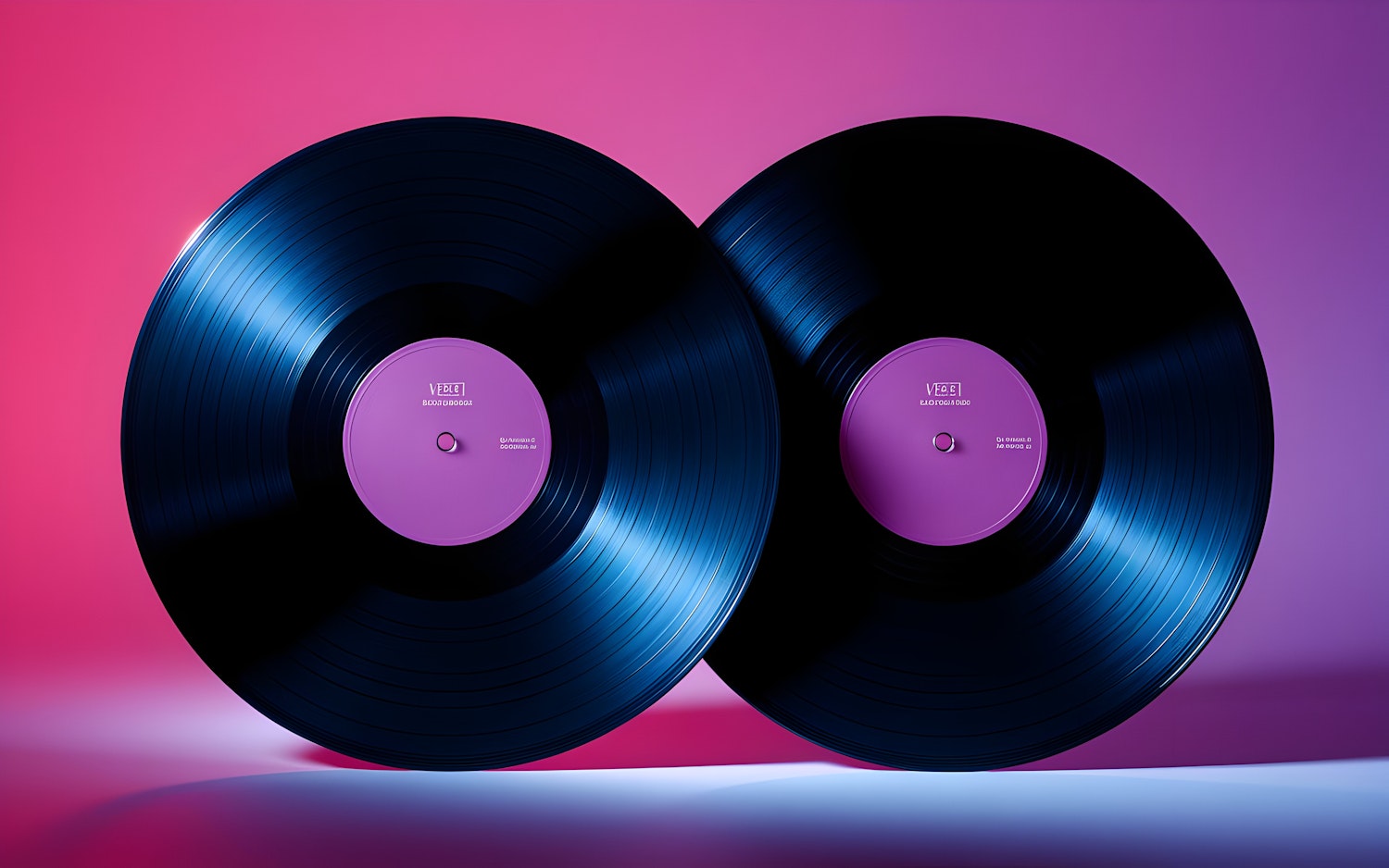 Two glossy black vinyl records with purple labels on a pink-to-purple gradient background, creating a retro-modern aesthetic.