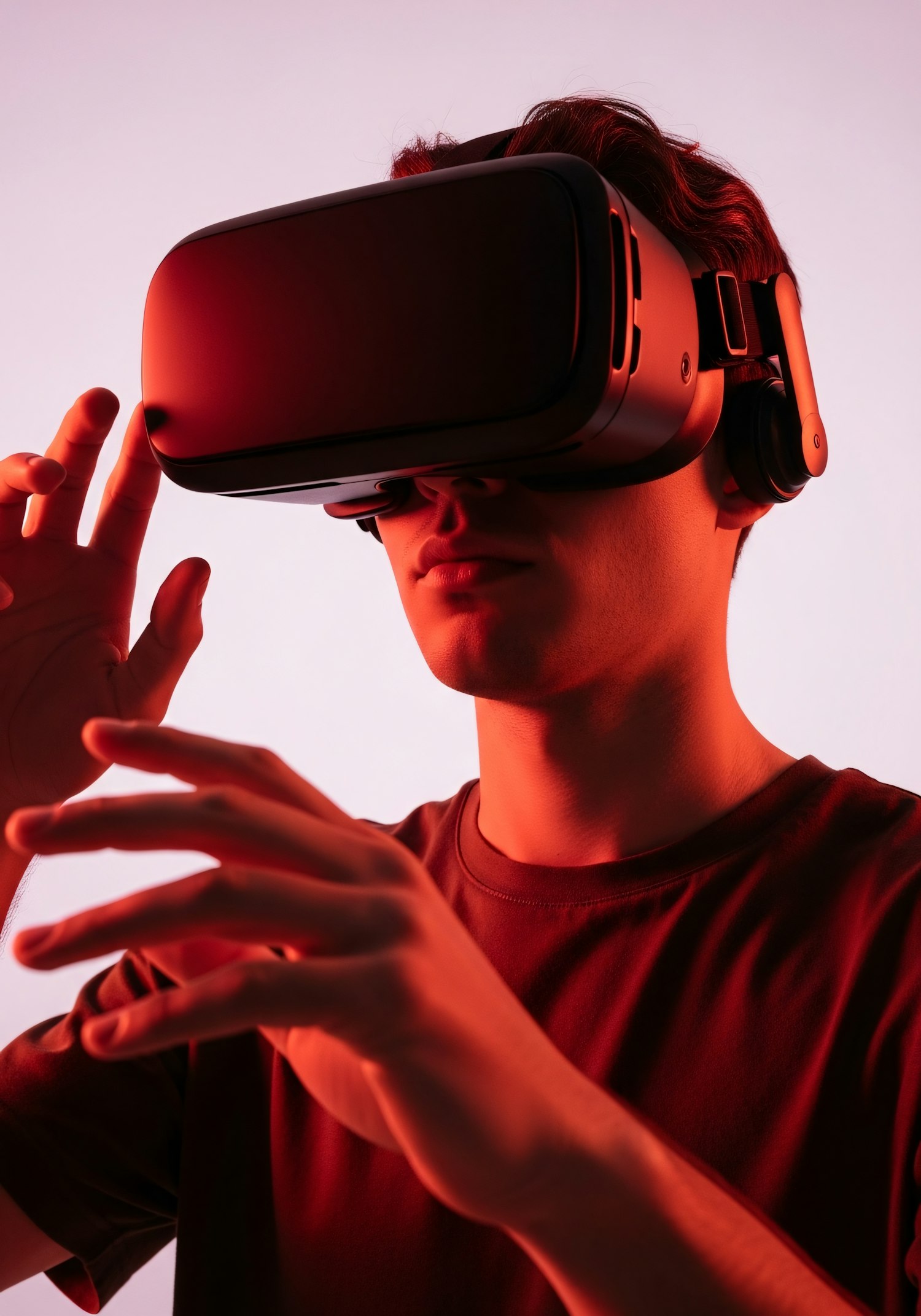 A person wearing a VR headset interacts with a virtual environment, illuminated by a warm red light, creating a futuristic vibe.