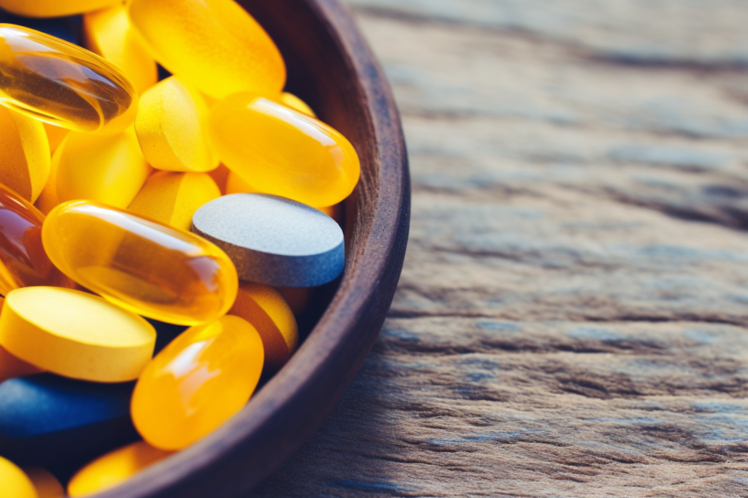 A wooden bowl filled with vibrant yellow capsules and blue tablets on a rustic wooden surface.