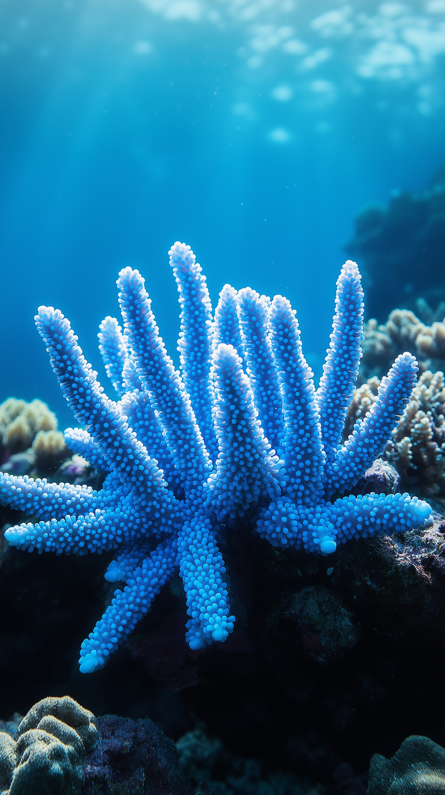 Vibrant blue coral in a serene underwater scene, showcasing marine beauty and diversity with light filtering through the water.