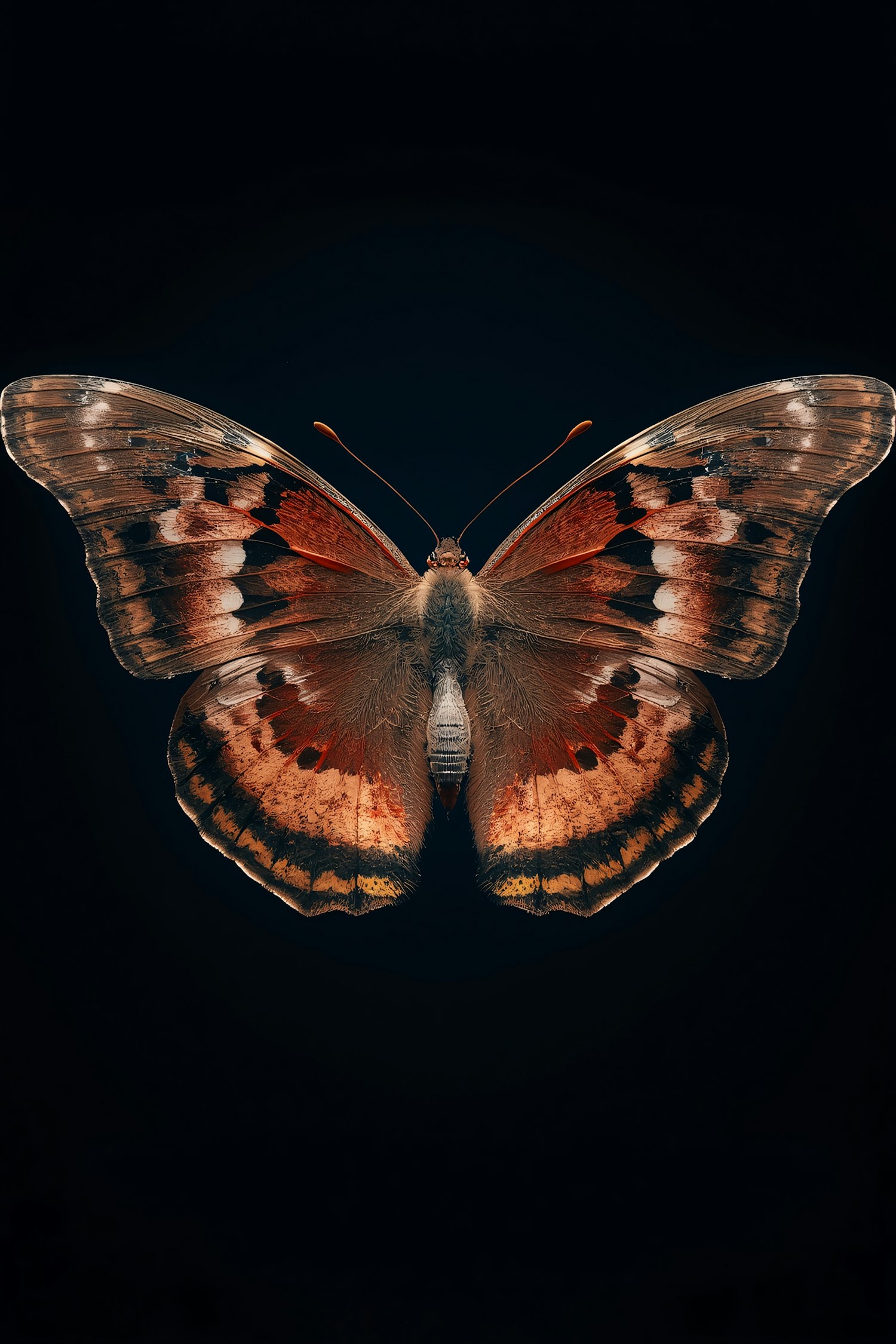 A vibrant butterfly with detailed orange and brown wings against a dark background, showcasing its intricate patterns and textures.