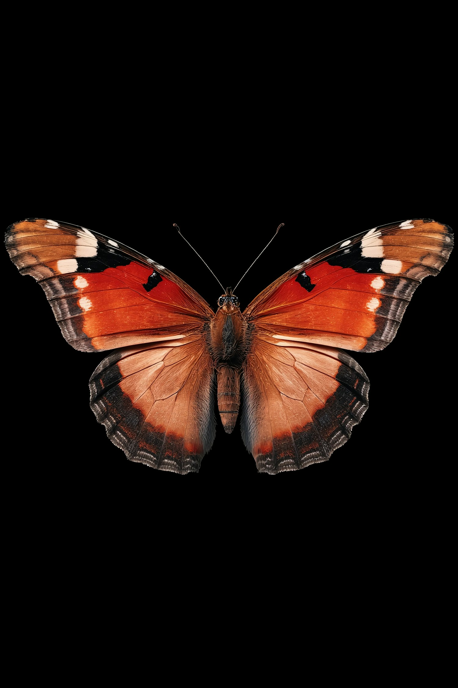 A close-up of a butterfly with vivid orange, black, and white wings, set against a black background, highlighting its intricate details.
