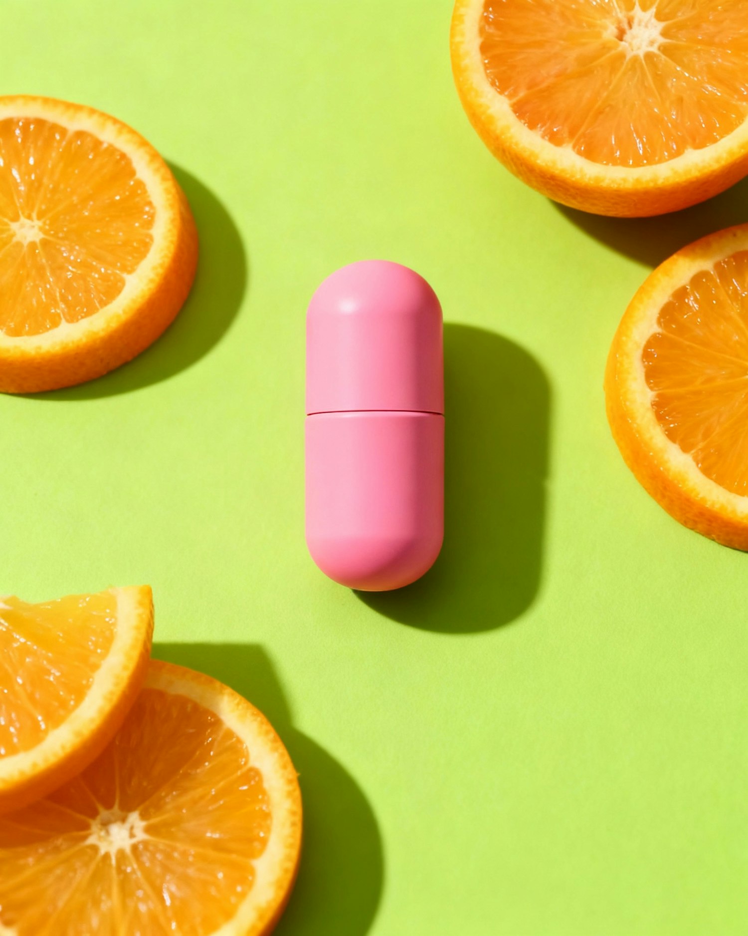 Bright green background with a pink capsule and fresh orange slices, creating a vibrant and minimalistic composition.